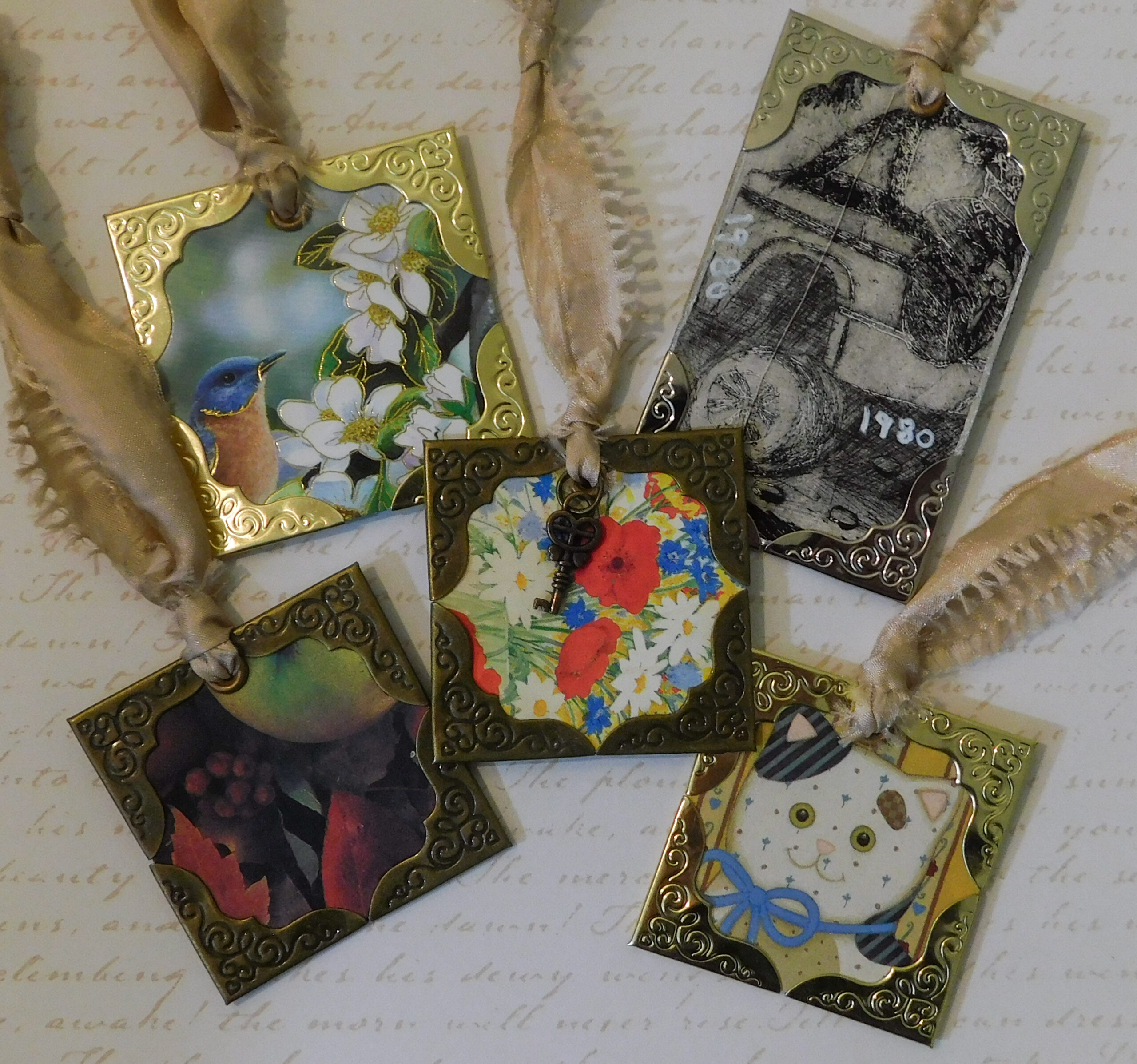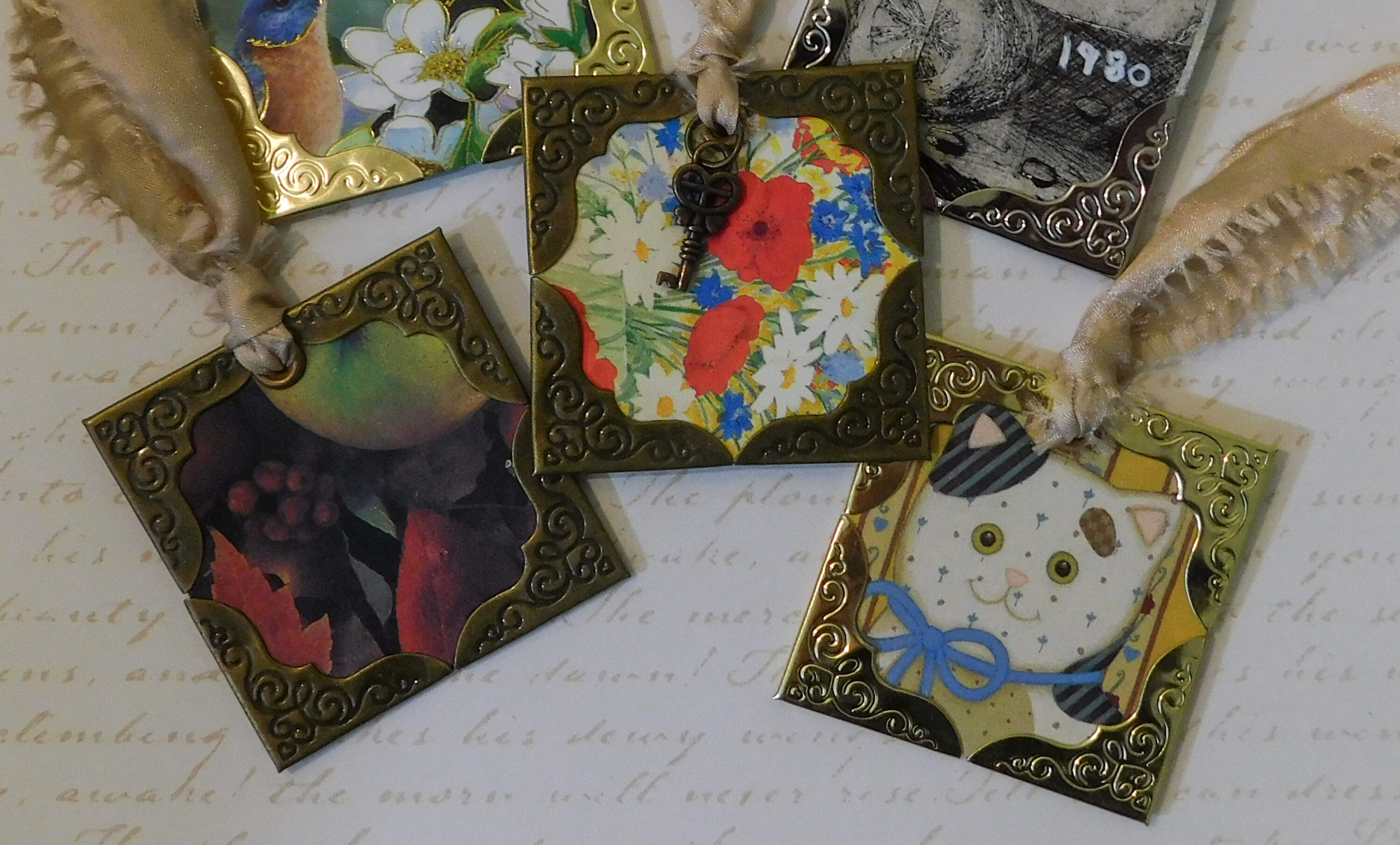 Gather some 3/4″ metal book corners and make some embellishments from sentimental ephemera. You can make ornaments, large book charms, book plates, souvenir place cards, photo gifts or just hanging decor. If gifting a journal pop one in a pocket on a journal book cover. Use photos, cards, letters, drawings, fabric, lace or any other sentimental item. Reduce your sentimental ephemera to smaller keepsakes you can store in a box and display on special occasions.