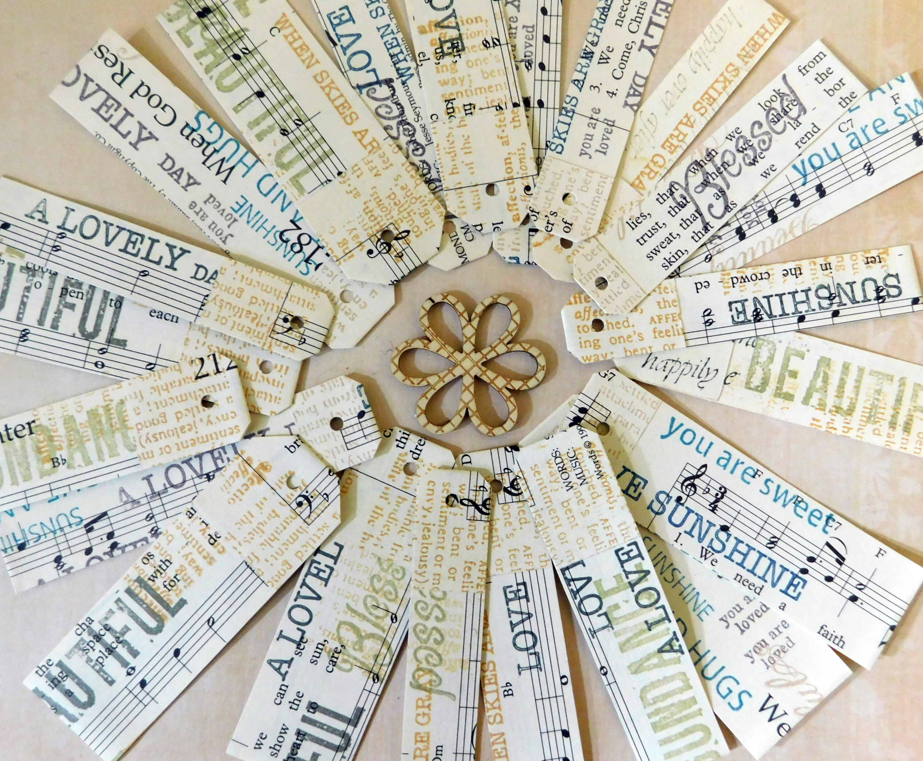 Choose any paper base from a book or music sheet. Choose any words or phrases from your stamp collection that inspire you and choose an ink assortment for stamping. Cut and stamp randomly for interest.