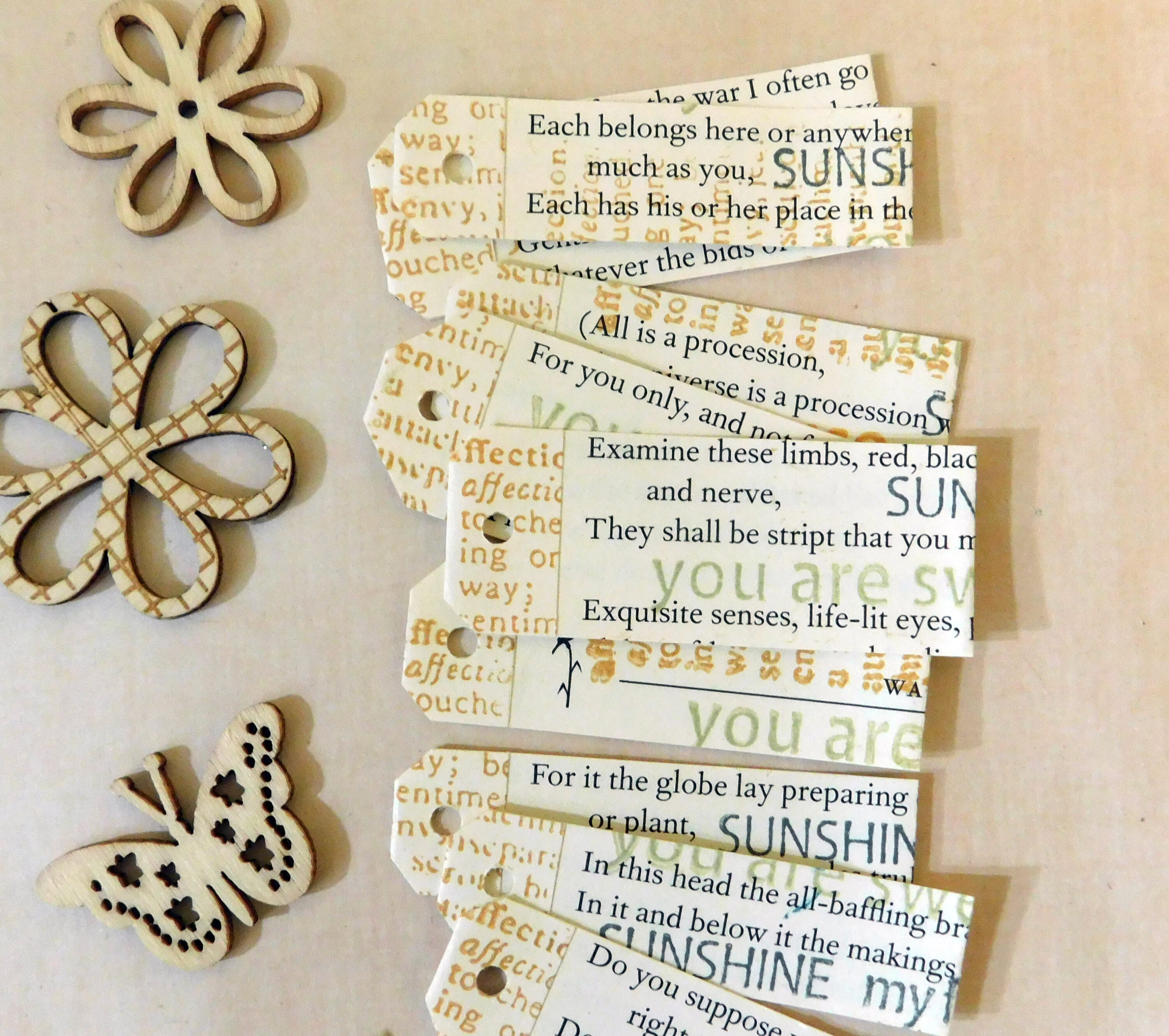 These tiny tags were created with snippets from poems and then stamped at sentence and paragraph ends. The fold over top was folded and stamped first to create the tab effect.