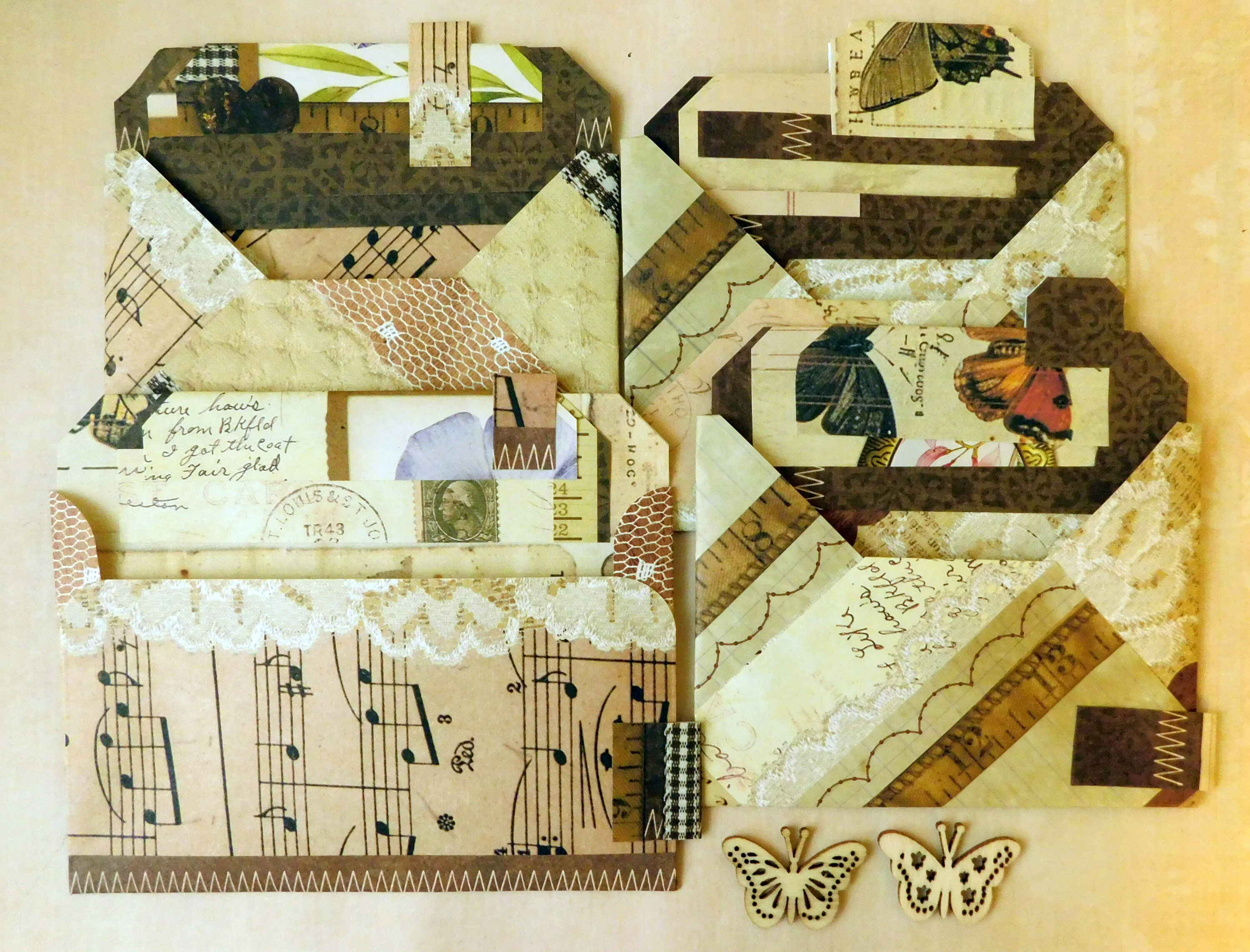 Pockets can be filled with tags, cards and embellished as much as desired. Try adding to tabs to different pocket styles in different ways, along the side or bottom. Punch a hole or holes and dangle some charms from them or just add some string for a little more texture.