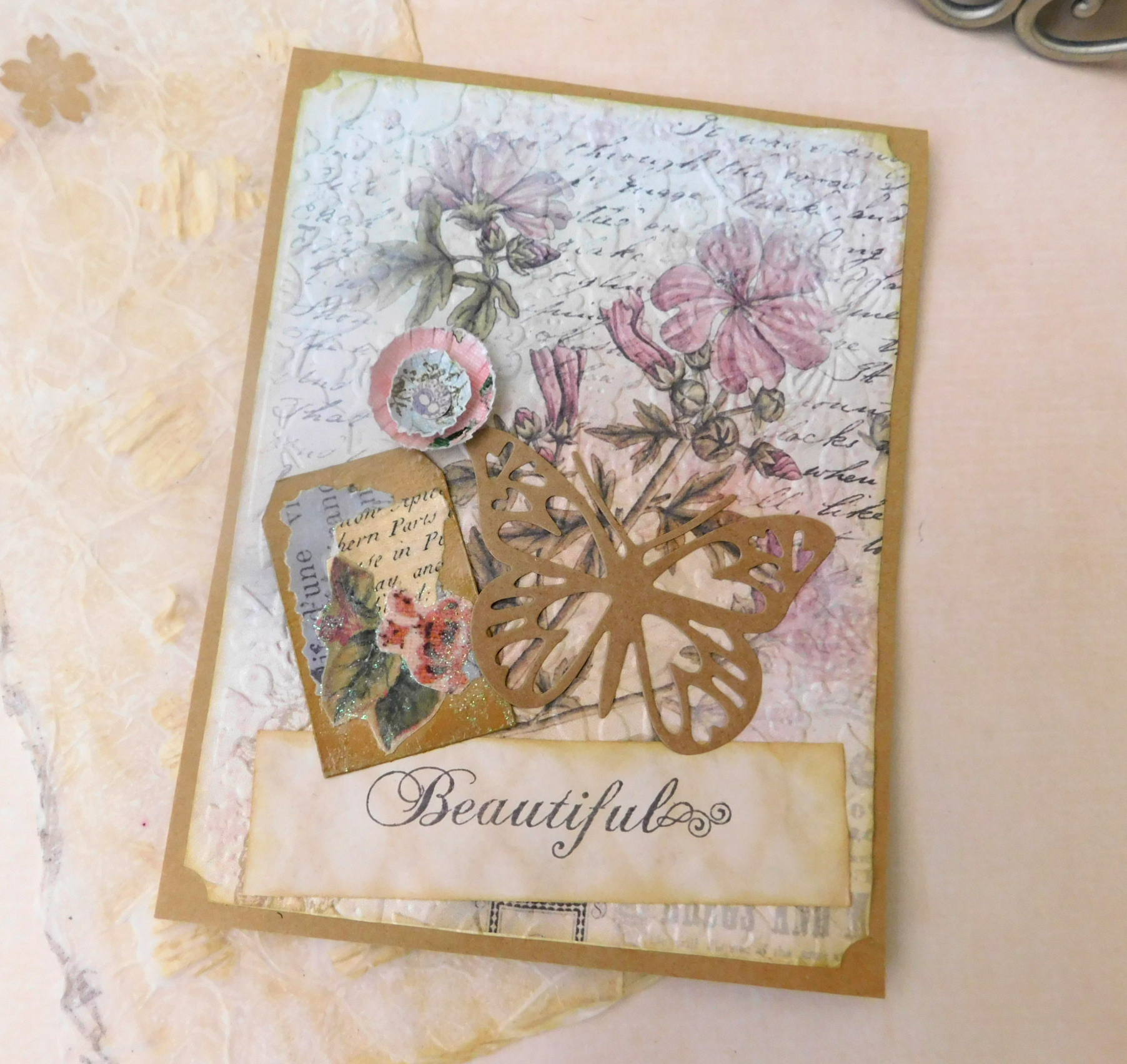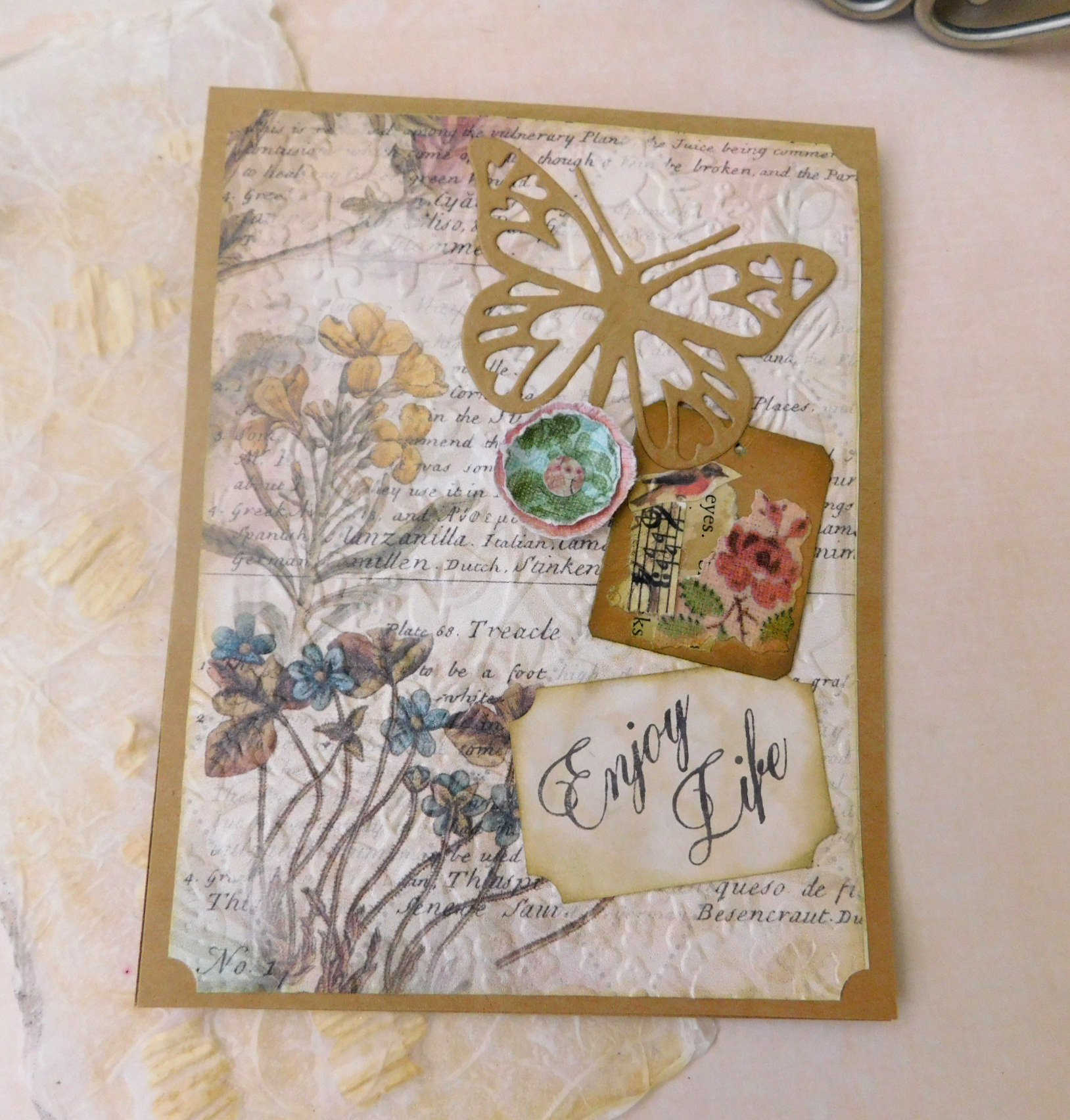 These pre-cut pieces are similar to surprise cuts which are a lot of fun and they came from this kit, Herb Garden. I did a post on how I reduced my paper stash greatly by doing this which you can find here. After gathering ephemera I just came up with a composition that was pleasing for each card. I embossed as well to add and extra touch. They are backed with book pages which I find gives enough strength to prevent cracking when embossing when using digitals printed on copy paper. This also saves card stock.