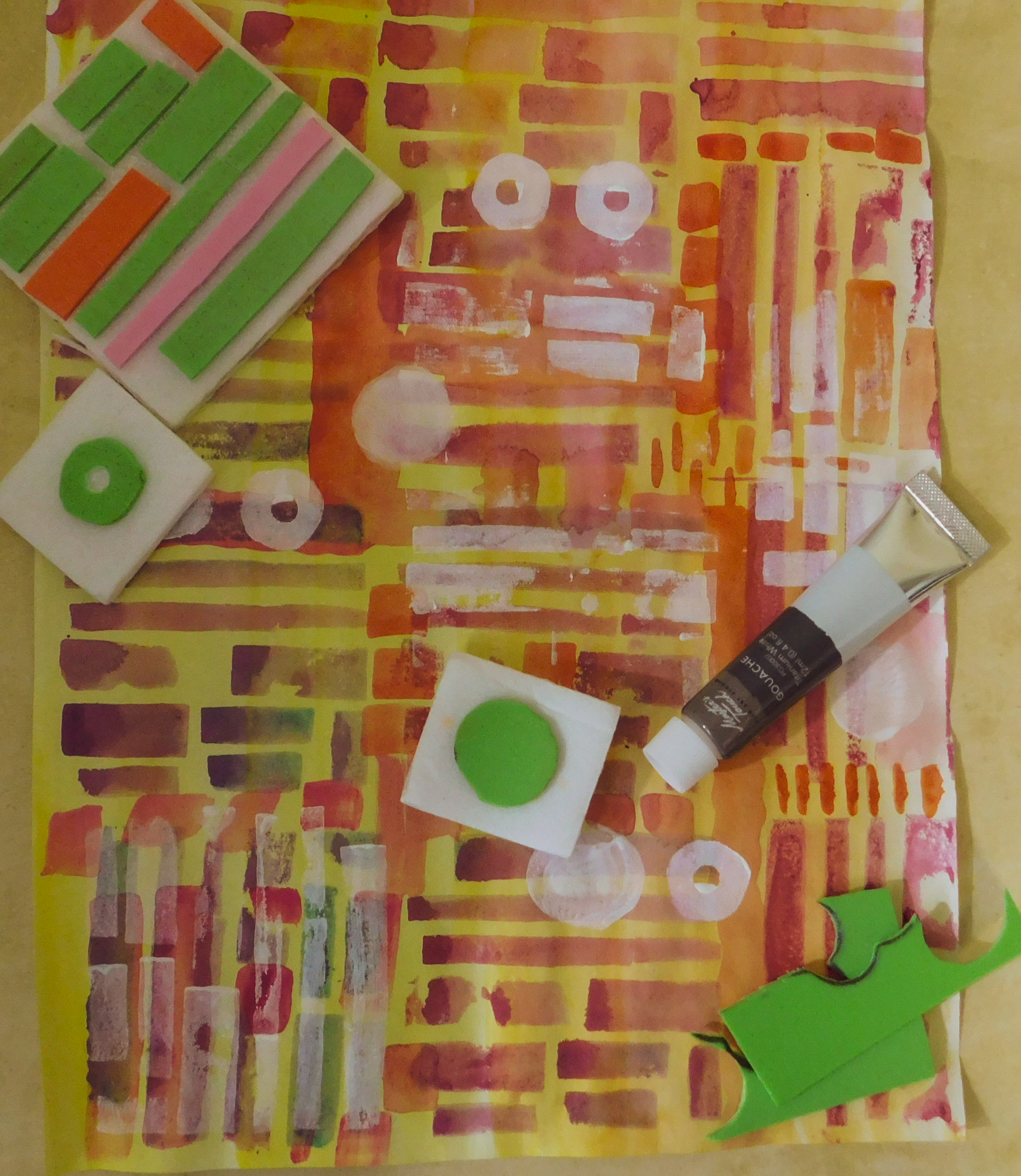 You’ll just need some scissors, adhesive foam, foam board, paper and stamping medium of your choice for testing your stamps. I use washable kid markers.