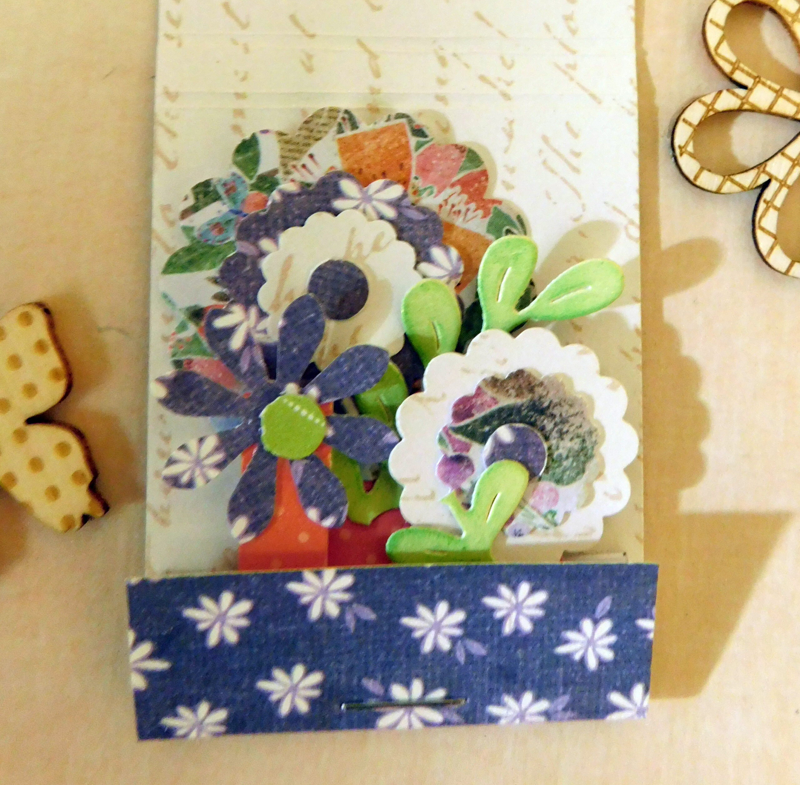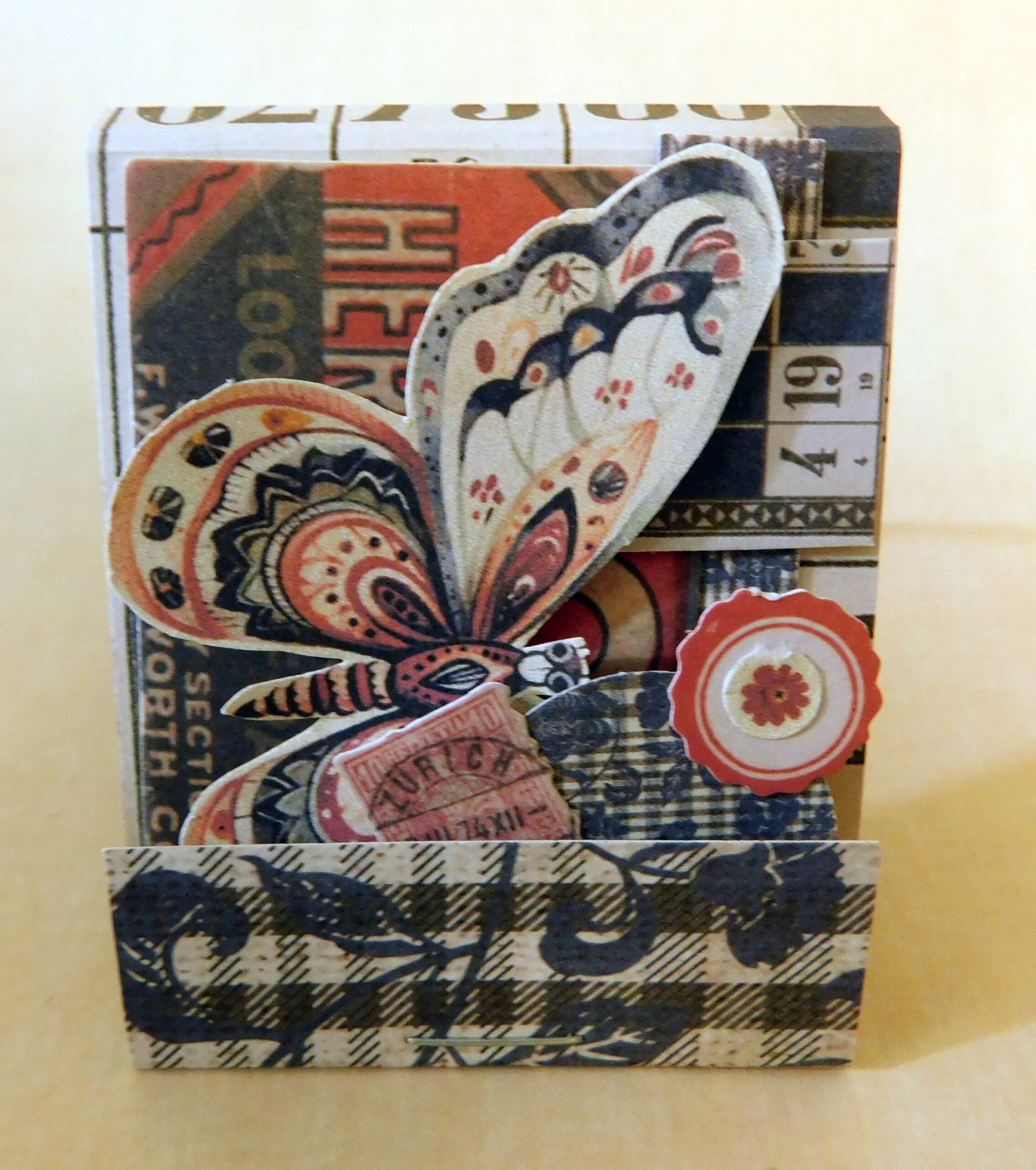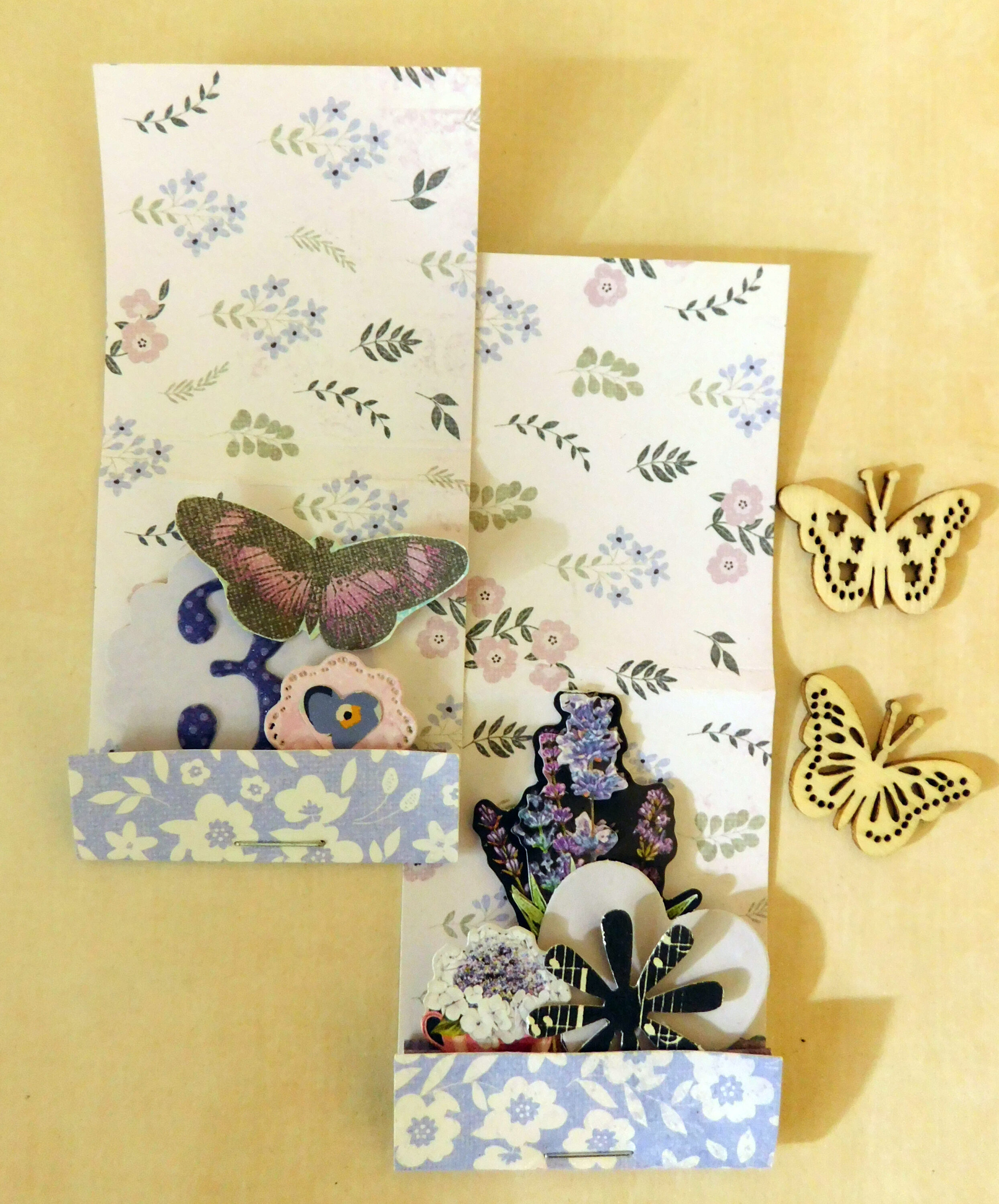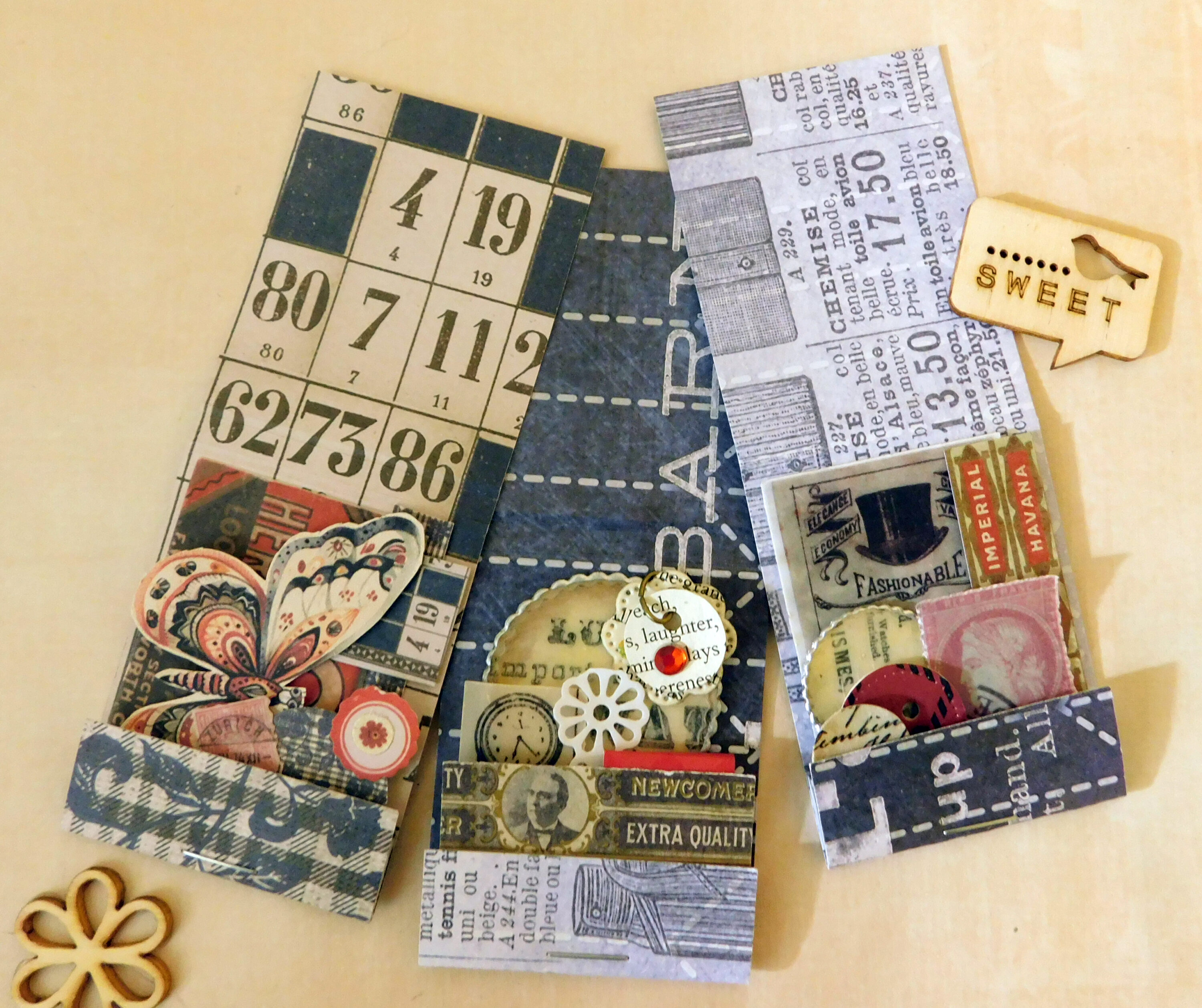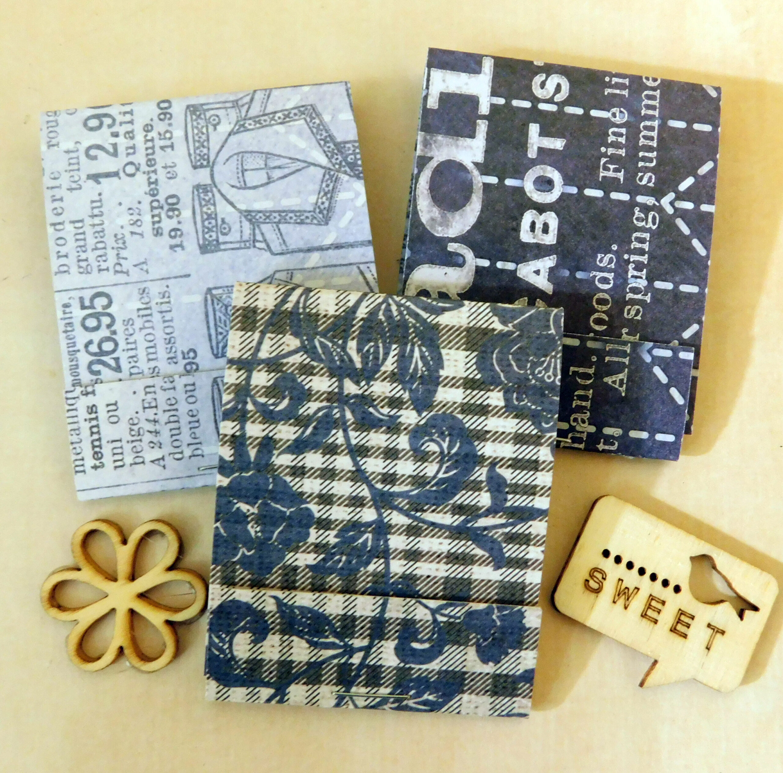 These matchbooks feature lots of little ephemera pieces, from mini cards to labels and even a tiny charm. The hat label is wax vellum so you can even play around with transparency effects.You can start with a background glued on the back cover if you desire.