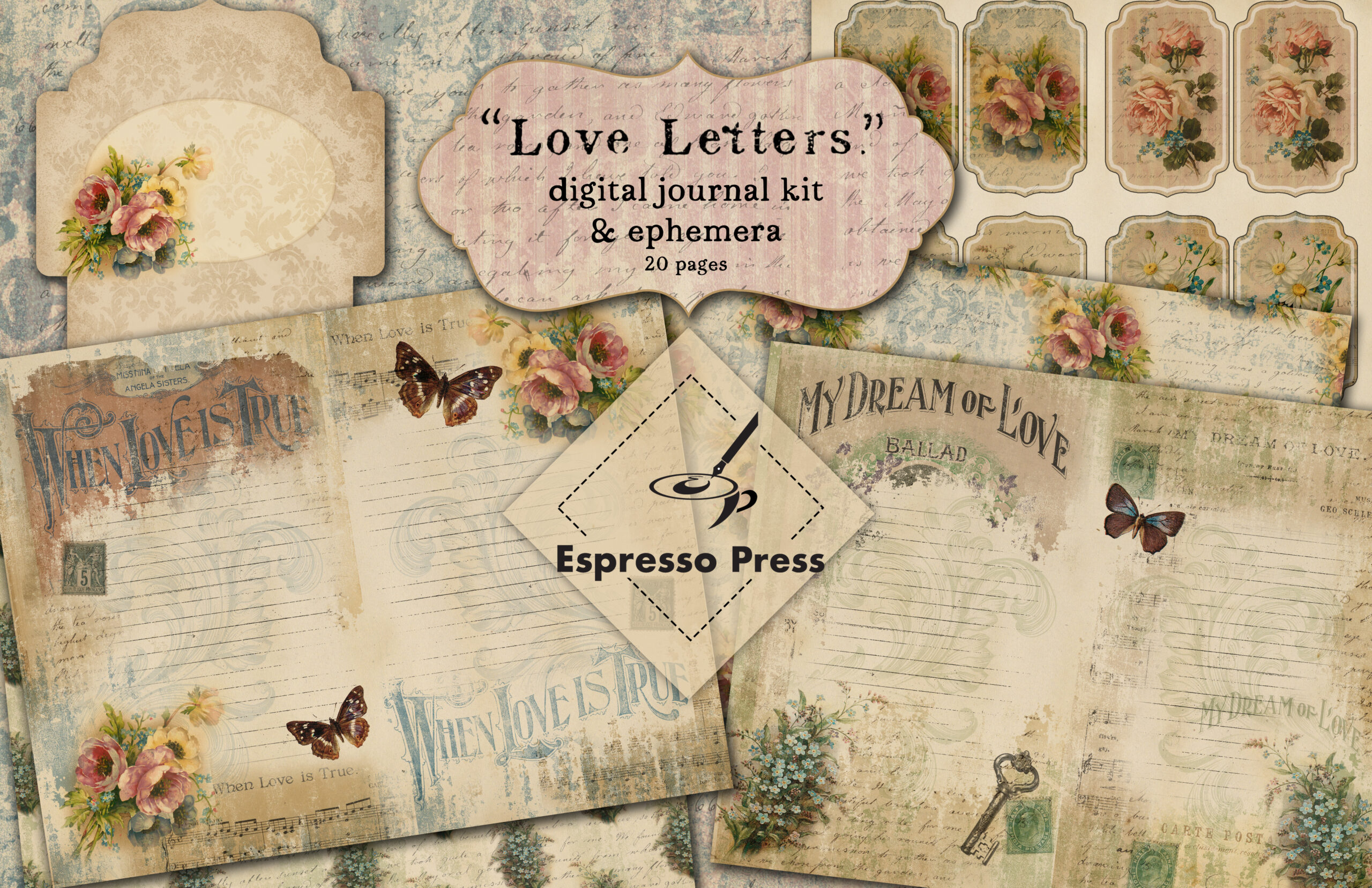 Love Letters Vintage Digital Journal Kit - Ephemera Included Vintage Love Letters Journal Kit, distressed, shabby design created from authentic 1800's antique ephemera, music sheets, letters and diaries. 20 pages in all including writing pages, collage pages, back pages. Ephemera included: envelopes, postcards, ATC cards, journal cards, calling cards, stamps, labels, postal/love letter writing related. Lots of variety for paper crafting! About 182 MB.