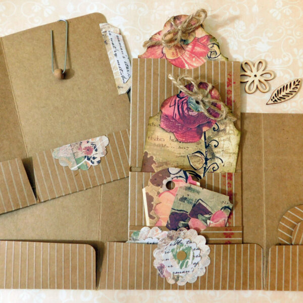 Closures and embellishments are your choice using the leftover 1 1/2″ piece. Some decorated examples are in the photos and video. Tag sizes are 2 1/2″ x 3 3/4″ and 2 1/2″ x 3 1/2″ (blue set).