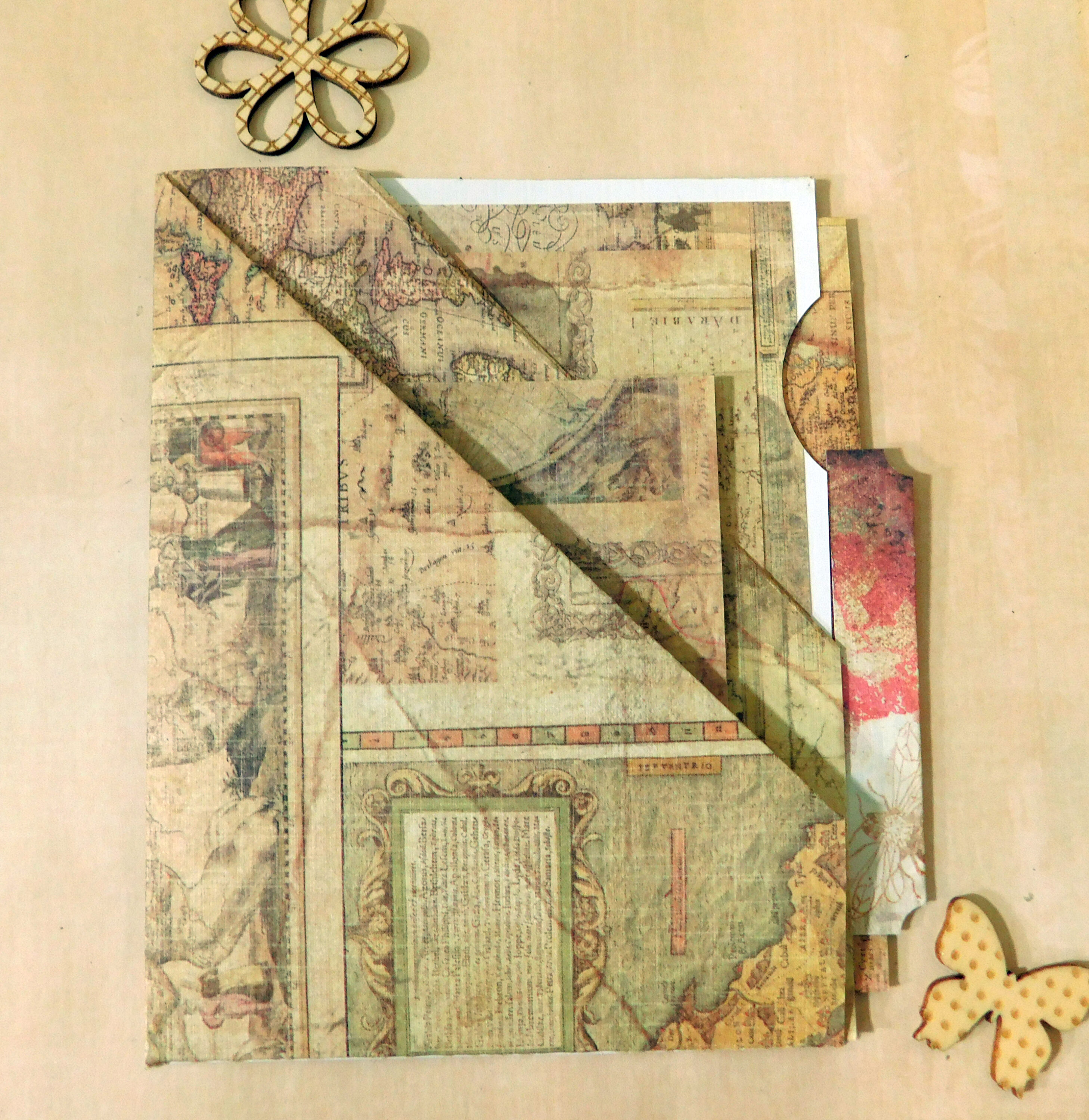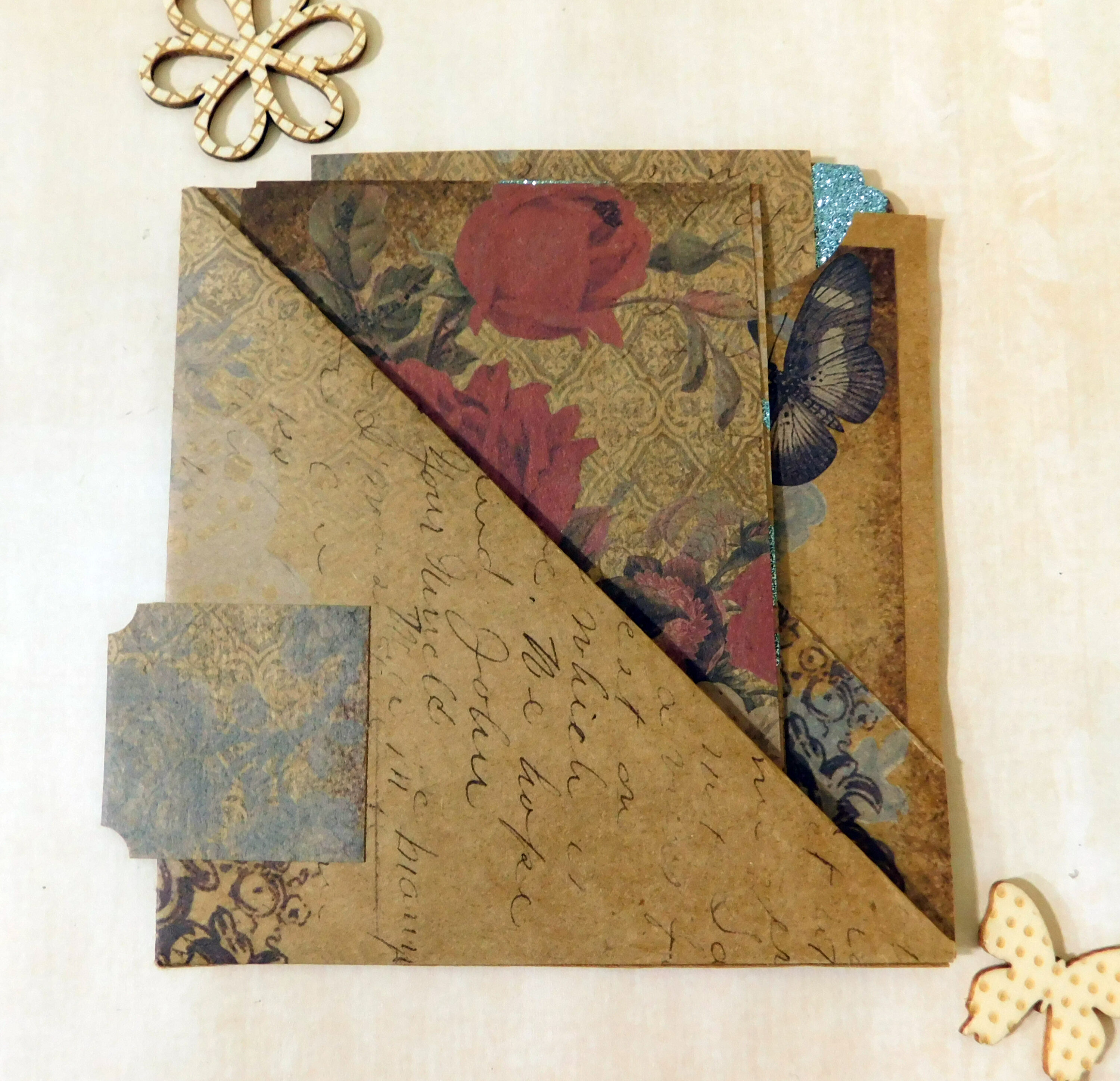 The final size is 4.25″ x 5.5″ which is a standard A2 size card. This triple pocket has a lot of storage for gift giving, happy mail or as an ephemera holder for in your journal. Can also hold a mini book.