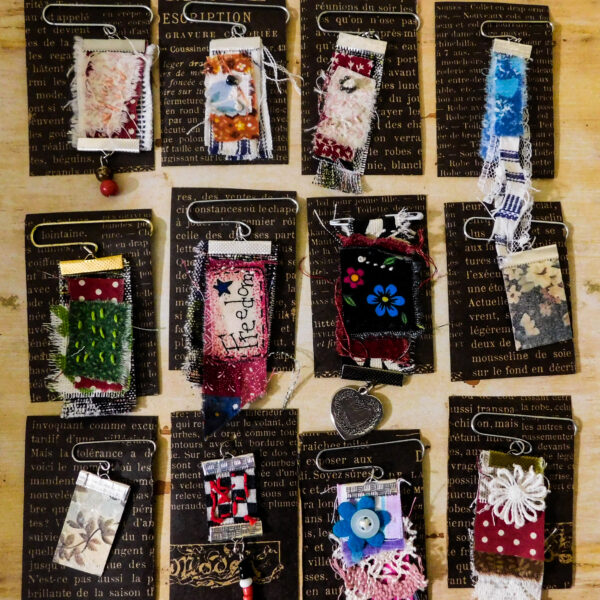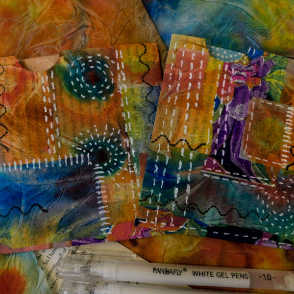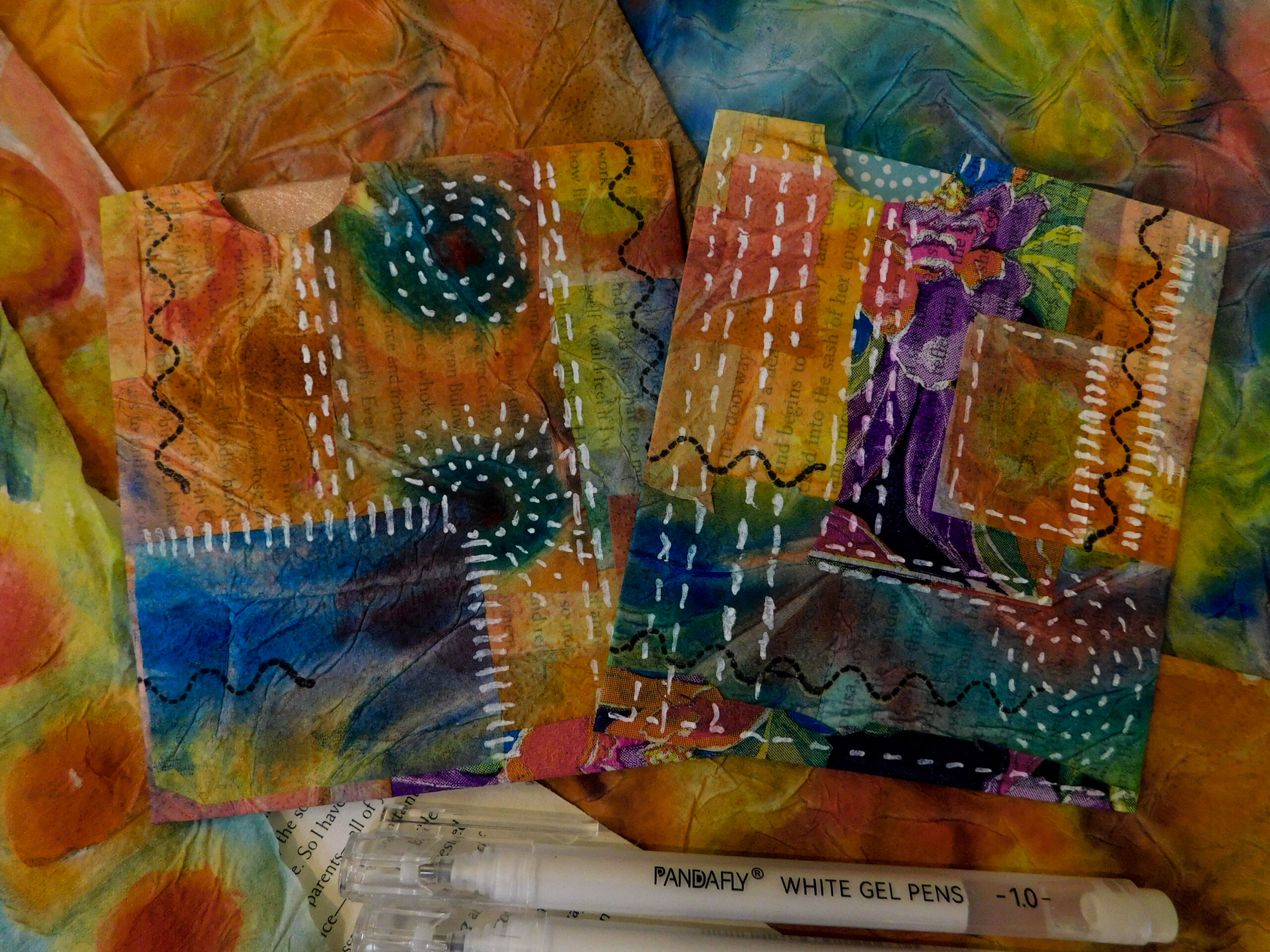 Sashiko Stitch Pockets A true trash to treasure project that utilizes watercolor, assorted waste papers and a white gel pen
