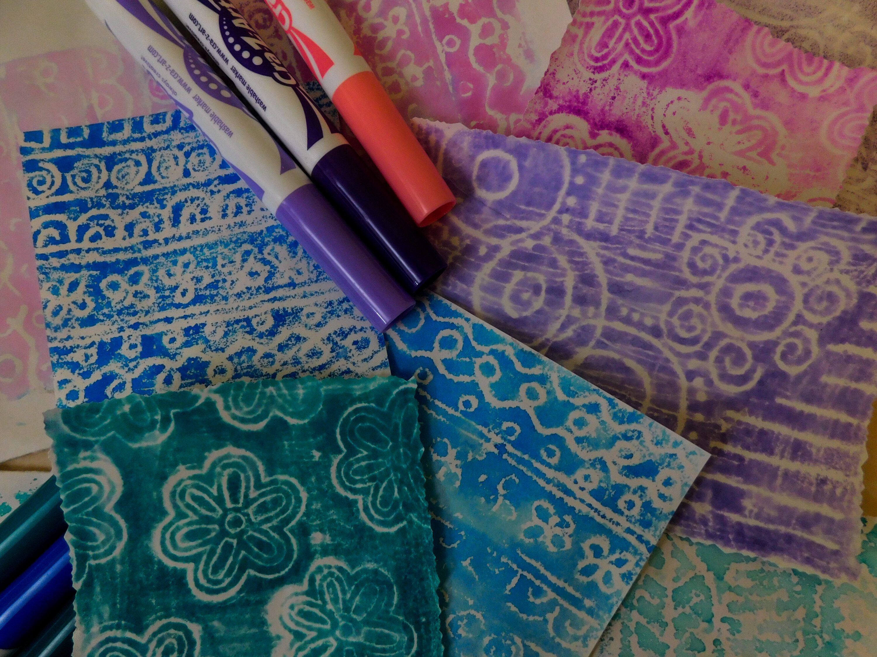 A happy accident led to a new printing plate and more washable marker fun. These foam board marker prints will retain freehand marks and even some rubber stamps (choose bold line wooden stamps). Create your own collage fodder using markers, ink or acrylic. They wash easily with cool water and soap.