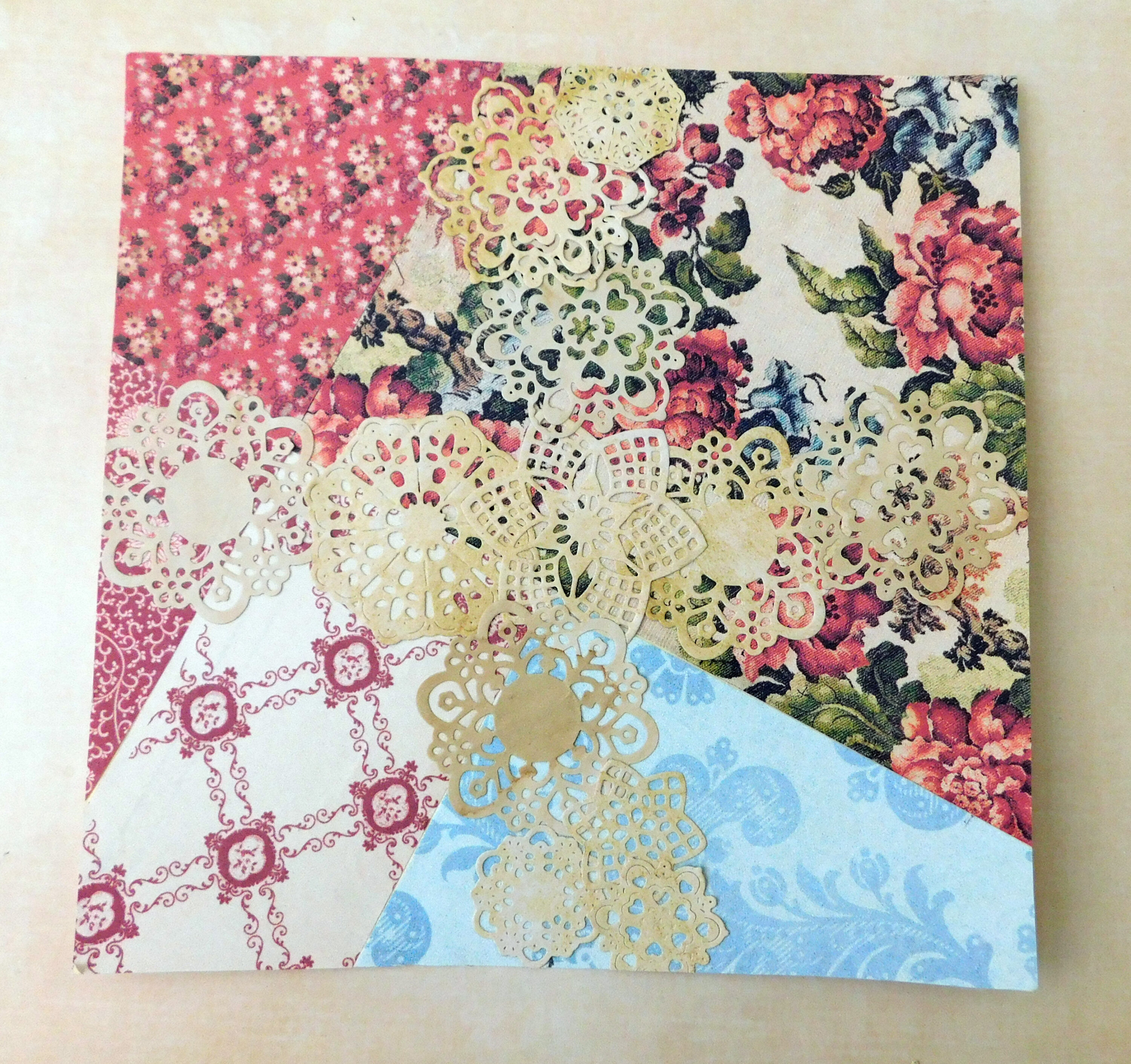 Piece papers in whatever design you choose or as many designs as you choose but it helps to always go off the edge. If you trace the first piece it will make aligning and placing the others much easier. Be creative in your paper selection to achieve a variety of looks.