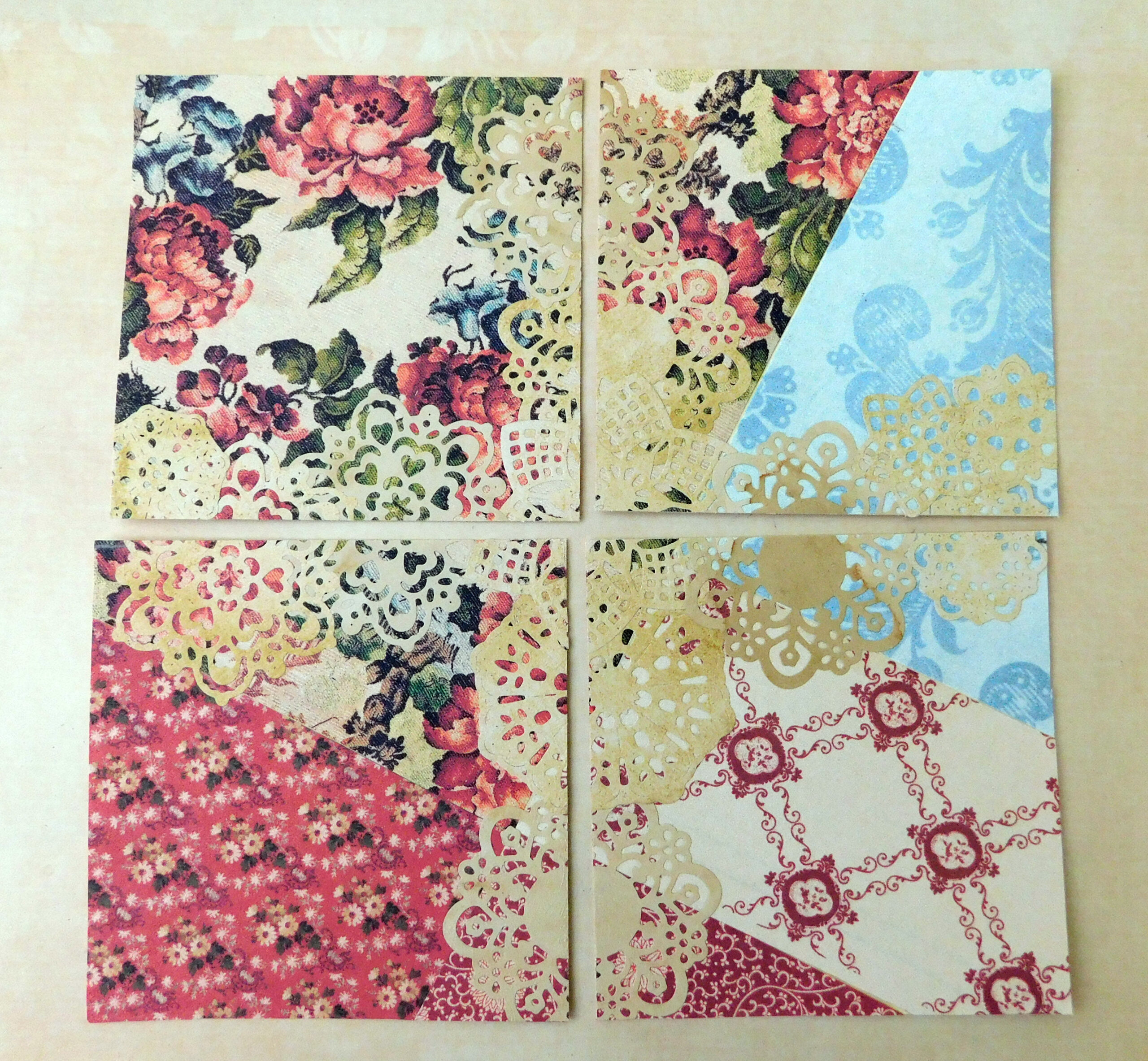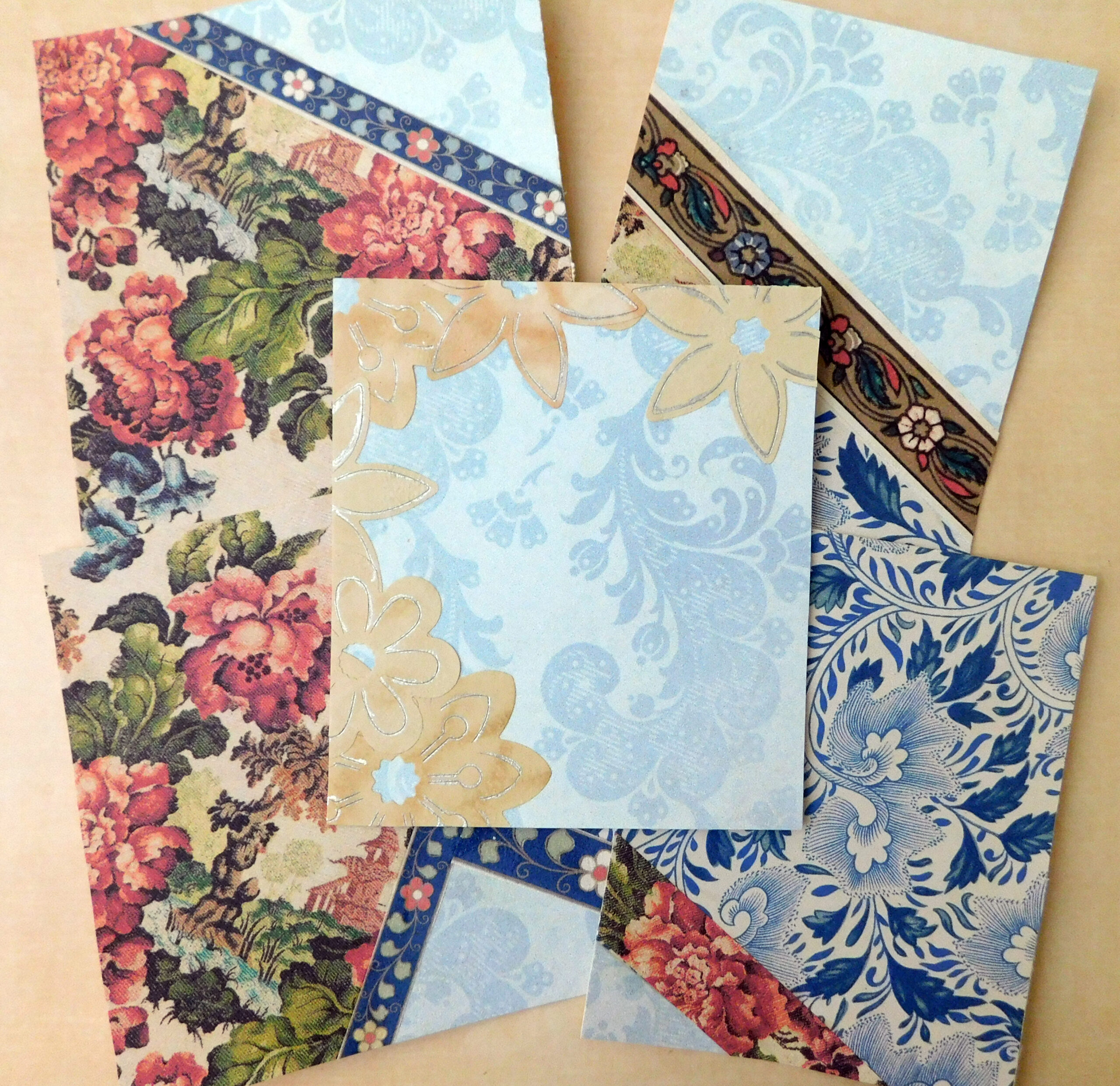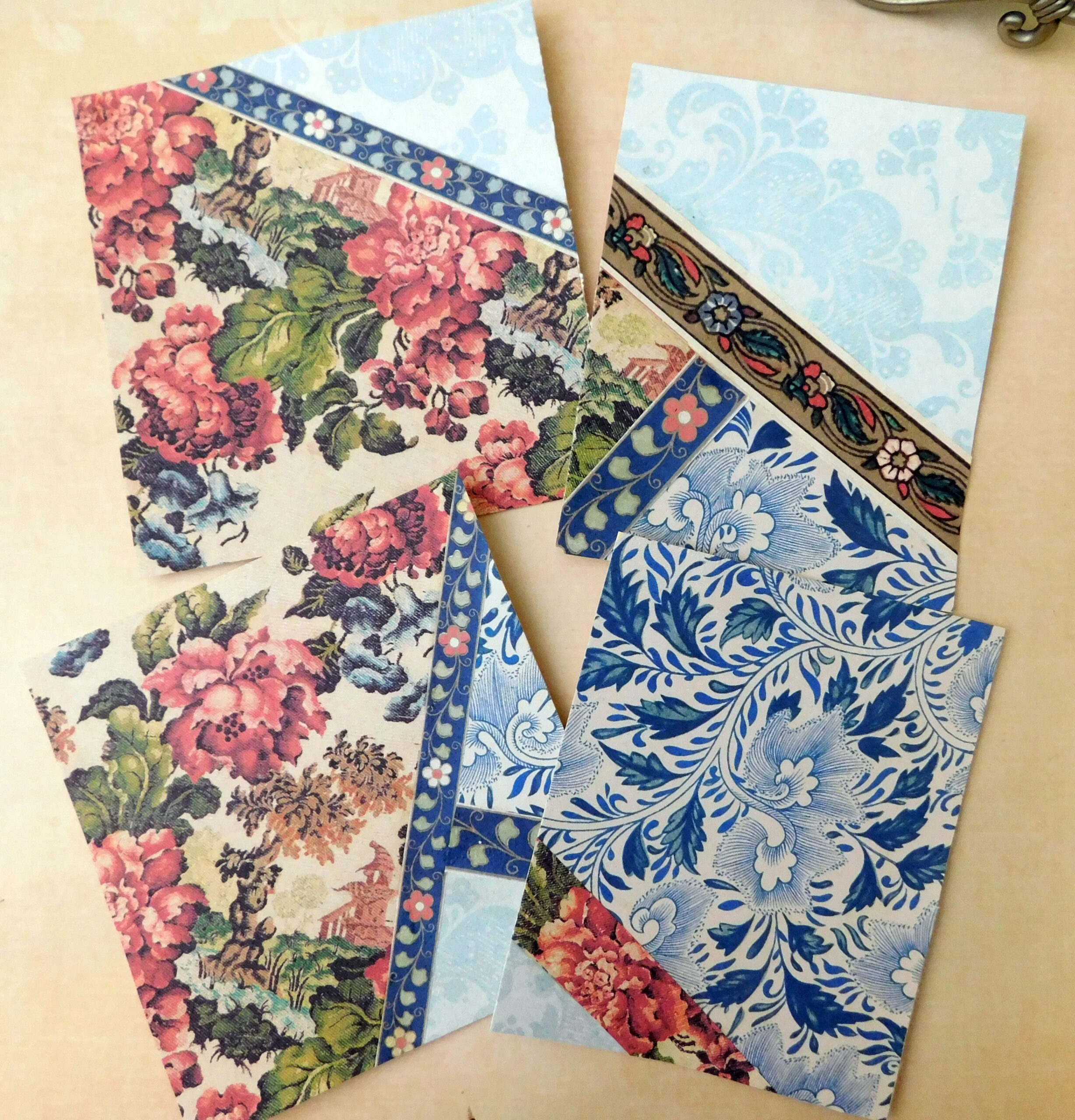 If you struggle with creating enough cohesive ephemera or making card sets this may be a technique you’ll want to try. It’s based on 4-way card designs, often used to create card sets whether greeting or note cards. The difference is that instead of using stamps and card stock we’ll be using paper for a background and as a second motif. You can also use these for pockets, tags, corner tucks or even as a cluster base. It all depends on how you scale and cut your base after putting them together but for this demo I’ll be using the traditional 4 way cut.