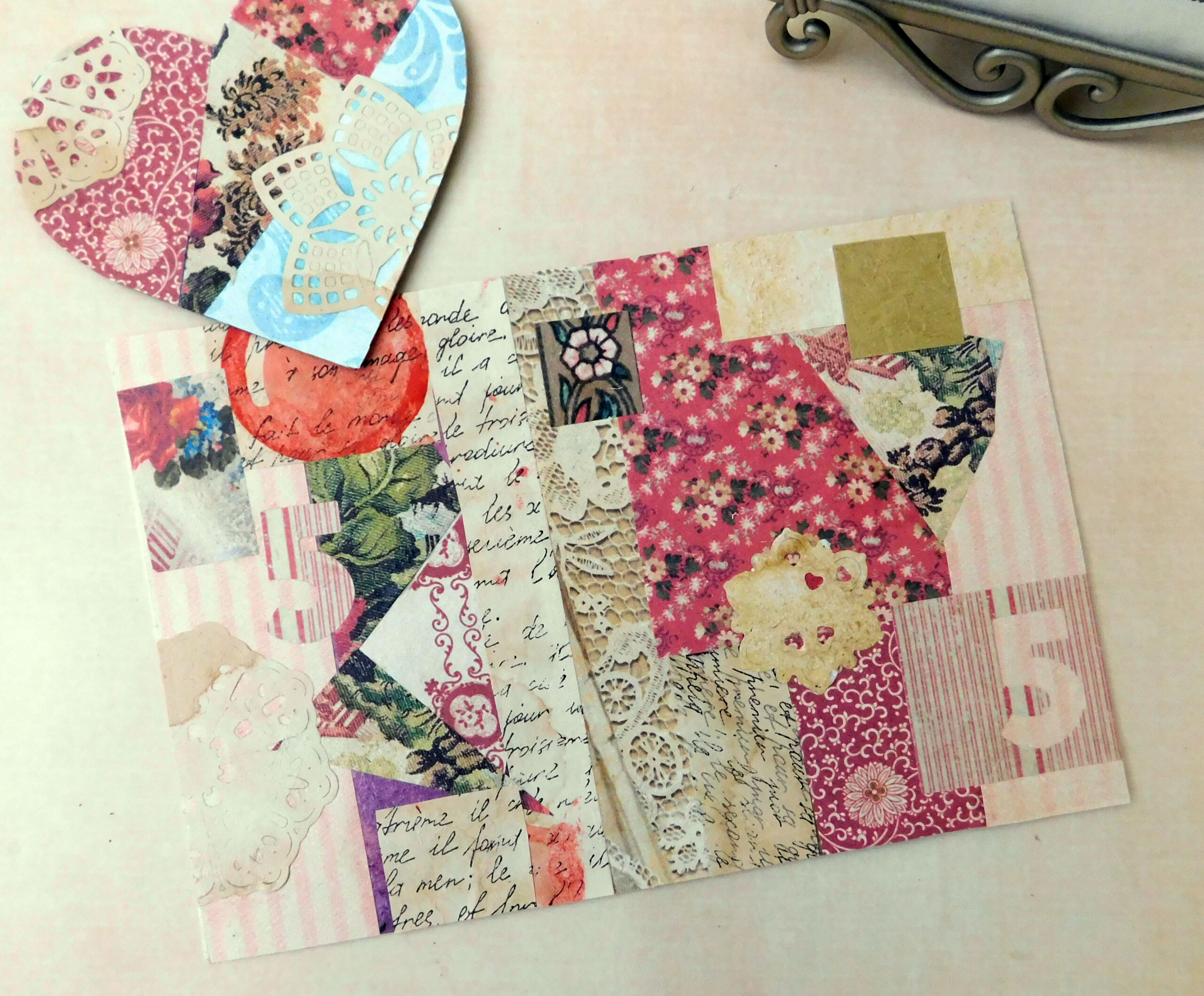 This combination uses all three techniques, pieced papers, 4 way layout and pressing. I got a new die that is perfect. I love it, just in time for Valentine’s Day crafts. I know, I know, the die will show up a lot better on plain card stock, that’s coming but when I try something new I like to explore possibility. I love these scraps from Vintage Journaler’s Companion so I combined them.