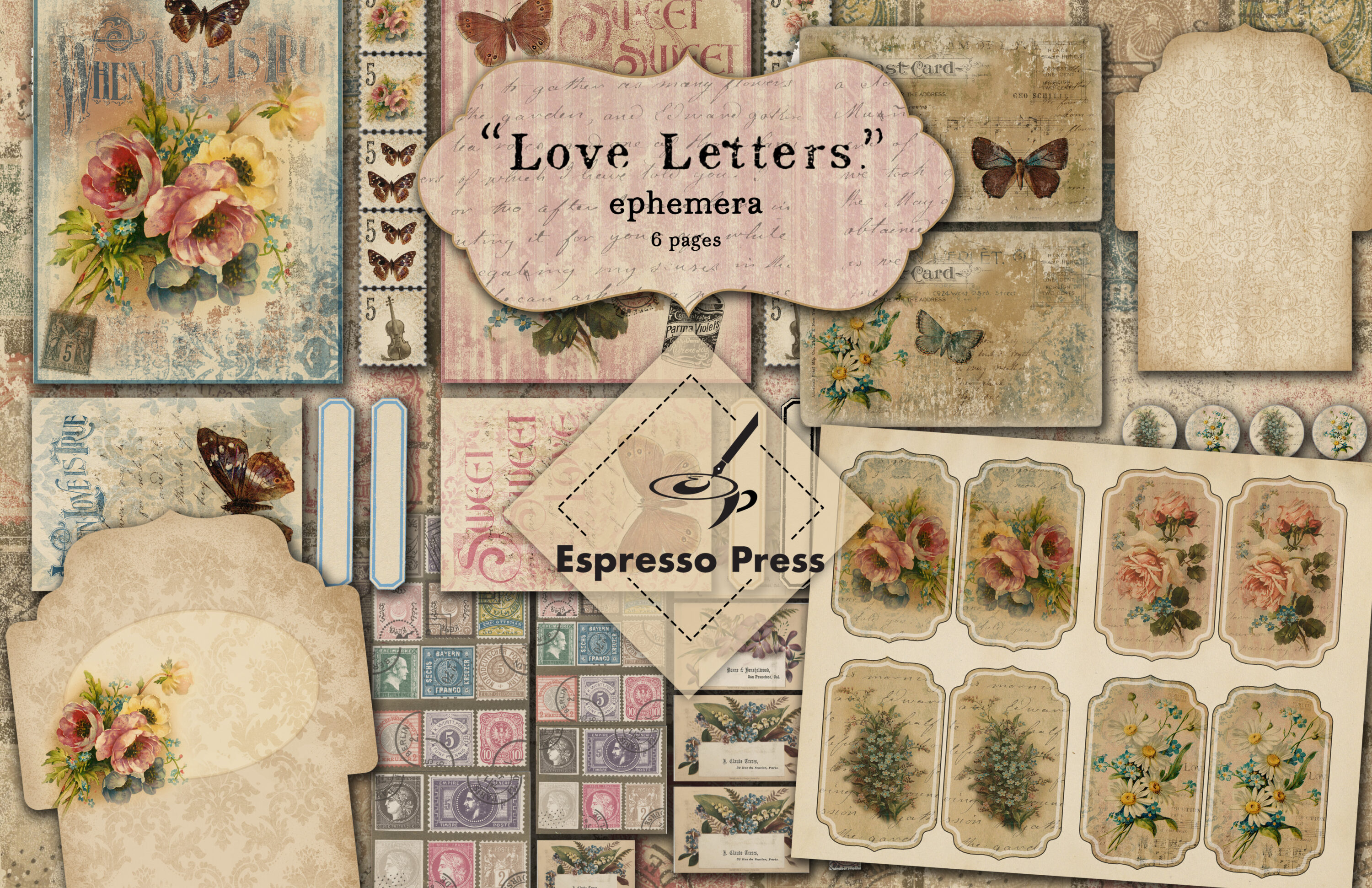 Love Letters Vintage Digital Journal Kit - Ephemera Included Vintage Love Letters Journal Kit, distressed, shabby design created from authentic 1800's antique ephemera, music sheets, letters and diaries. 20 pages in all including writing pages, collage pages, back pages. Ephemera included: envelopes, postcards, ATC cards, journal cards, calling cards, stamps, labels, postal/love letter writing related. Lots of variety for paper crafting! About 182 MB.