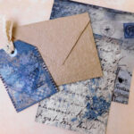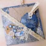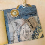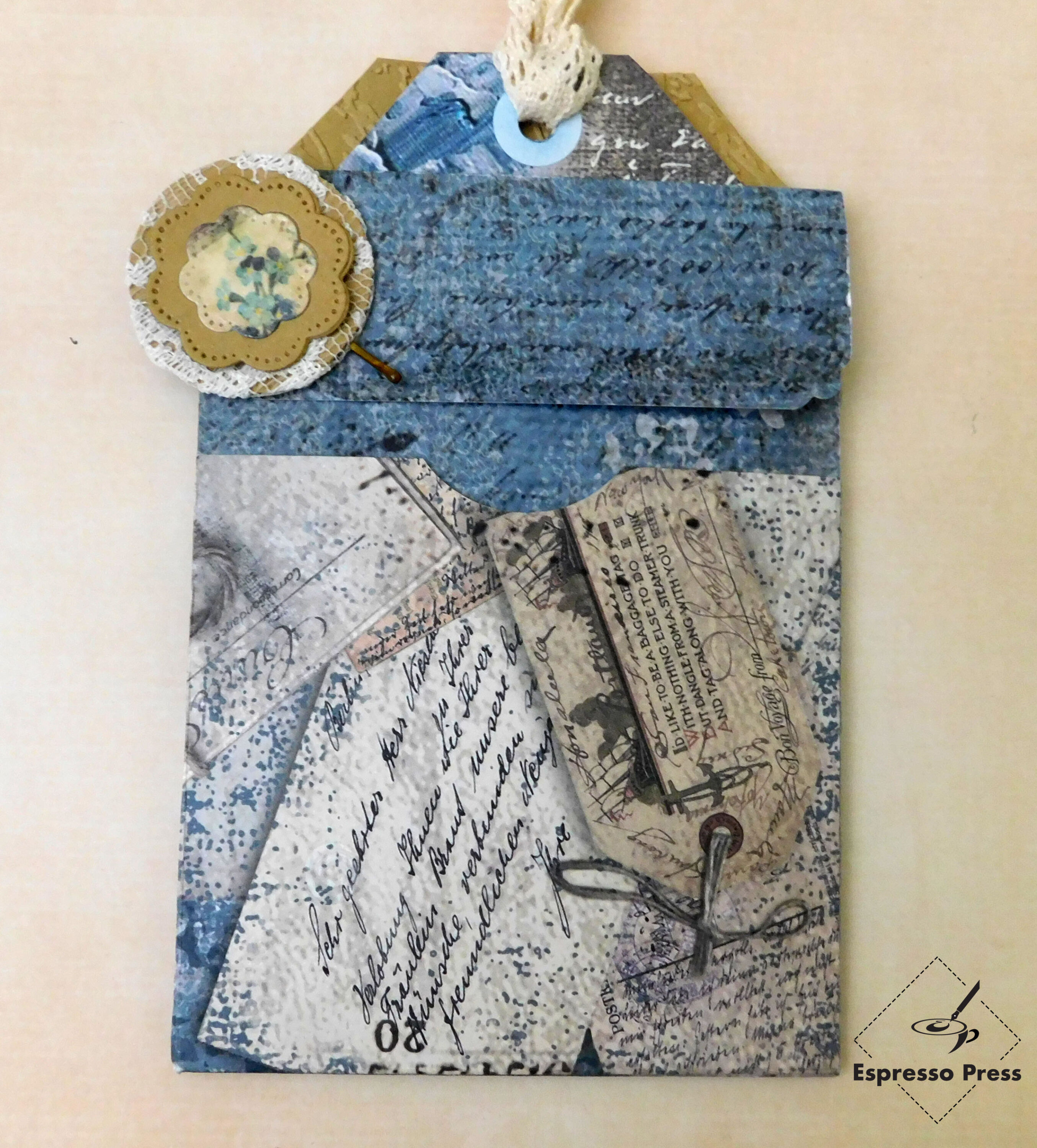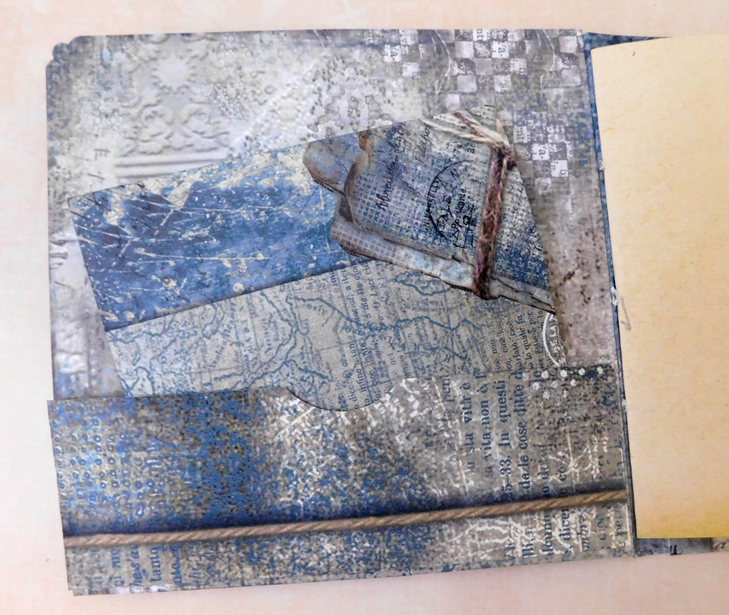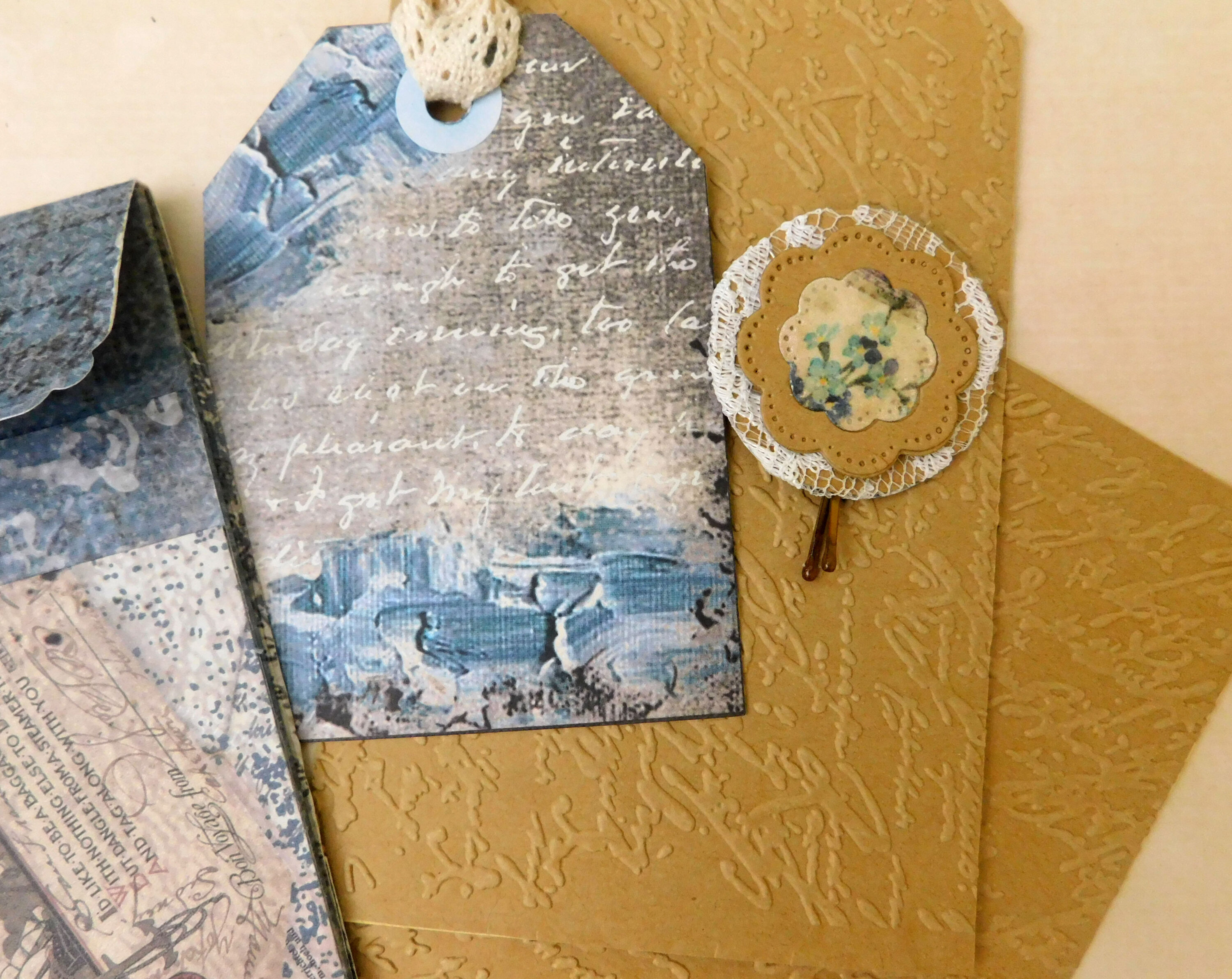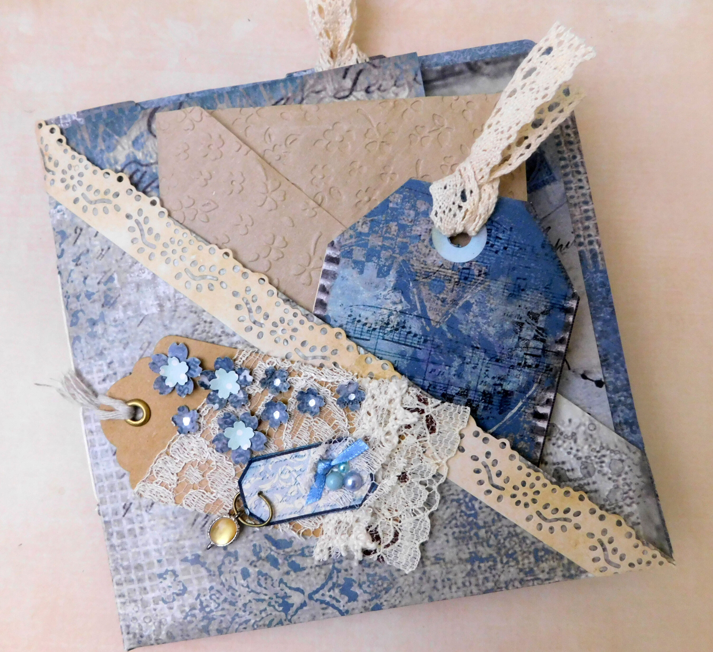 I chose Stamperia/Blues paper because this project calls for double sided and sturdy paper. The self included cover has two pockets in the fold design, a couple of photo mats, an envelope full of ephemera and a tag. The idea is that she completes the book as she desires (she’s crafty).
