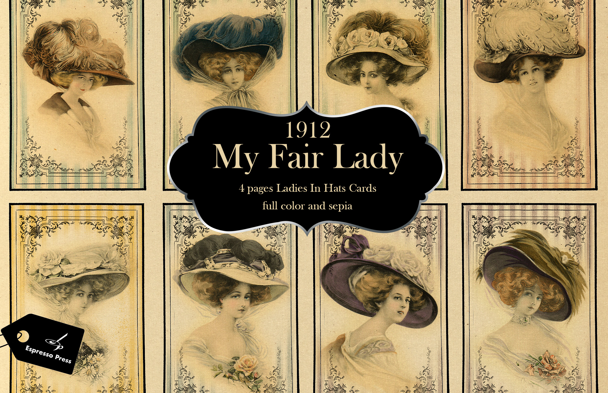 My Fair Lady - Digital Edwardian/Vintage Ladies in Hats Cards 4 Sheets beautiful 1912 ladies in hats cards, 10 smaller cards and 3 larger journal cards. In multiple colors. Easy to cut out frames with vintage paper background, no white edges. Two styles, full color and sepia. Sizes approx. 2.5" x 3.75" and 3" x 5". You'll use these cards for junk journals, paper crafting, scrapbooking and more! Approx. 26MB