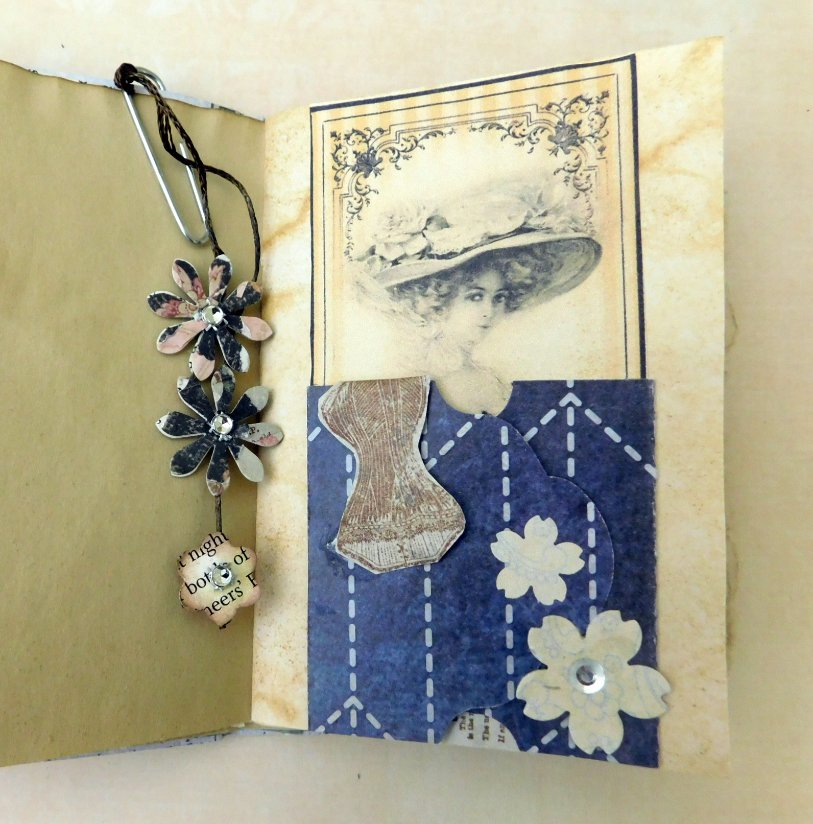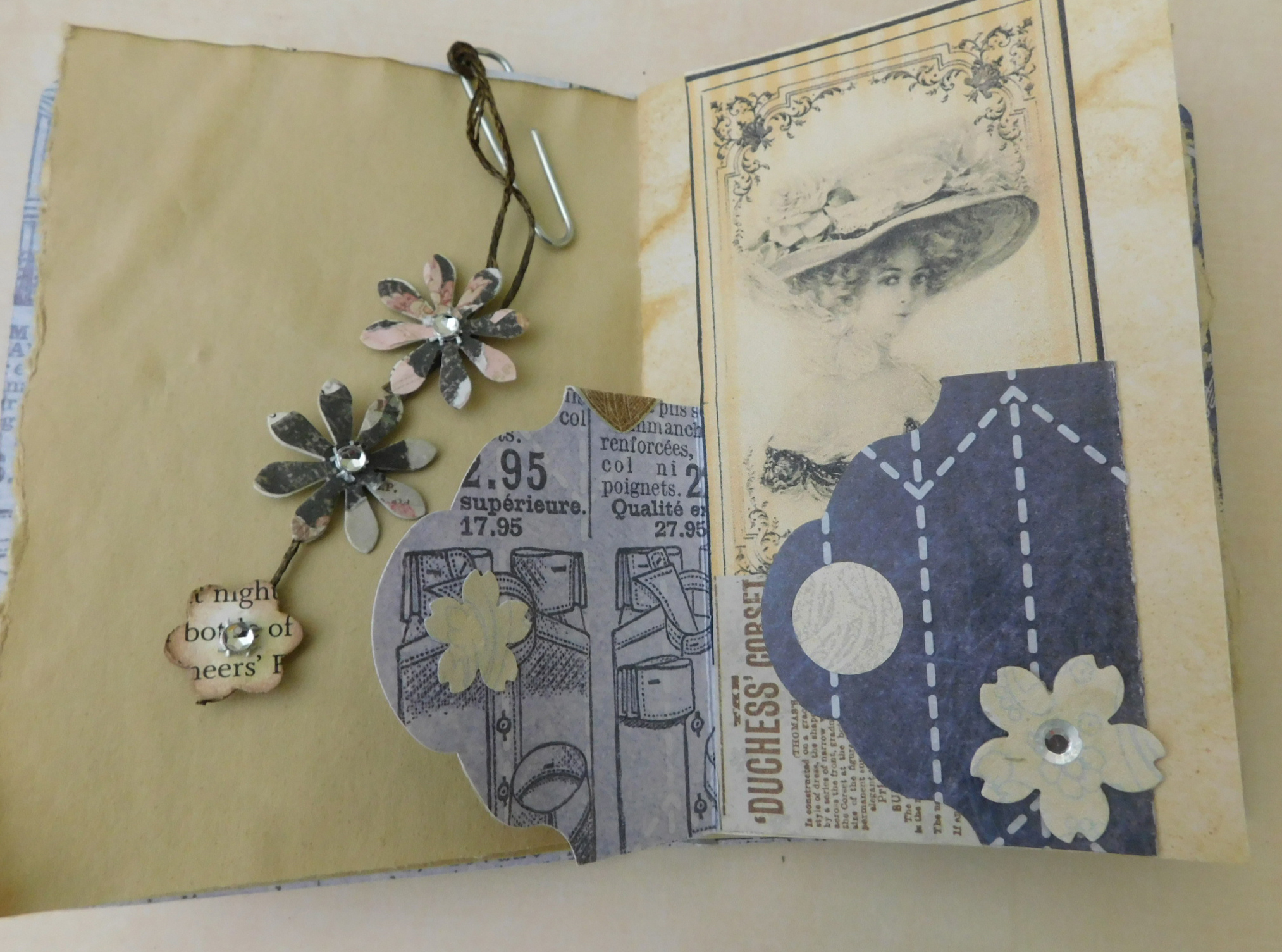 The tag fold opens like a door to reveal a corset ad which I thought was a little humorous. I wished I had a full length image but I didn’t have an appropriate one. I also could’ve done a lace up embellishment and that would’ve been nice too. I could also have used a paper doll….too many ideas pop up once you get going….