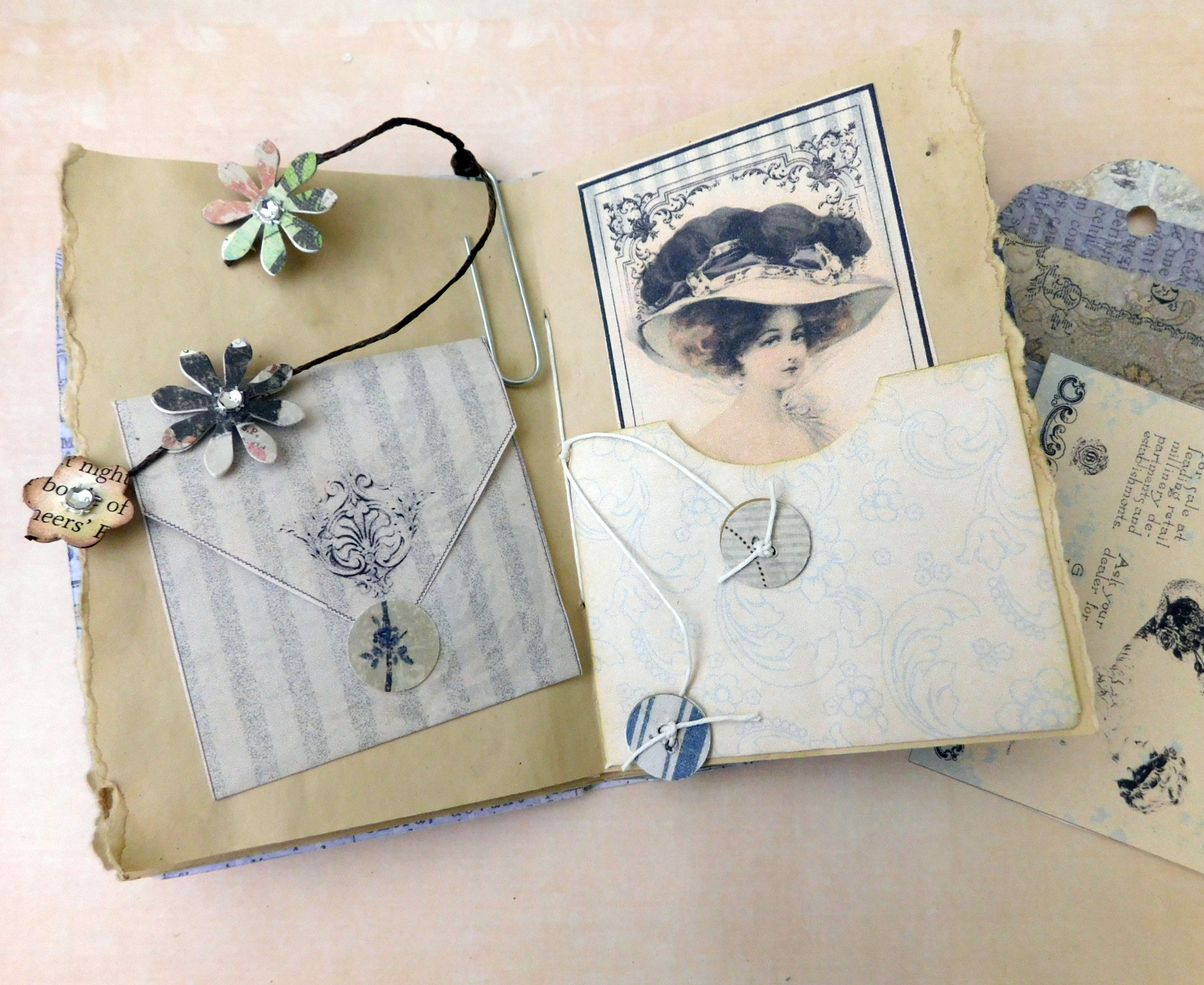 I wanted a clip on earring to make a cover closure but didn’t have just the right one so I will have to look for that and in the meantime I just used some journal jewelry as seen in this older post, paper charms. I will keep this one as a bookmark.