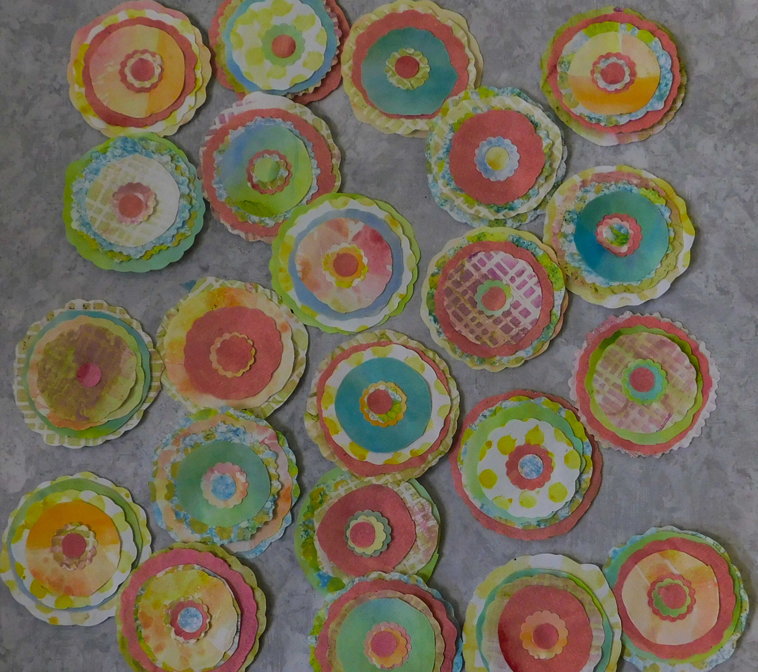 Odd numbers are more pleasing so opt for three, five or seven layers. Use either contrasting color or pattern between each layer but don’t worry about color matching. The mismatch adds whimsy and gives each flower an artsy touch. Doodle on them too if you want more variety.