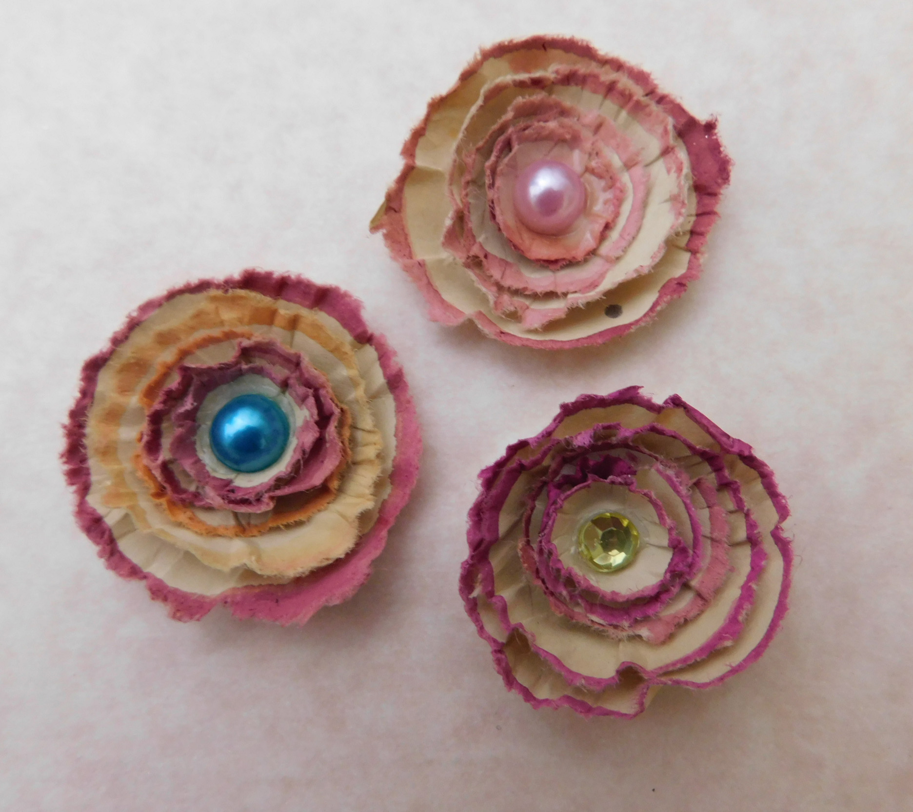 Since I don’t like spending all of that time inking either I used alcohol ink in the water to tint the edges of the circle as I go. I make one color at a time unless the colors will make a nice blend. Then just a little shaping with a stylus, glue and embellish the center. A light spritz of water on the back makes shaping easier or usually I just sit them on a damp paper towel for just the right amount of dampness before shaping which depending on the paper helps prevent tearing. I usually layer in three or five. You can also glitter the edges. If you want to just stick with paper for embellishing the center you can mold little beads with water and glue by rolling tiny bits of paper between your fingers, like paper clay. I often do that when I want to keep things more natural looking and this is usually what I add to my more conventional paper shaped flowers. I make a bunch and let them dry and then when I need them I have them pre made, they are easy to ink with any color.
